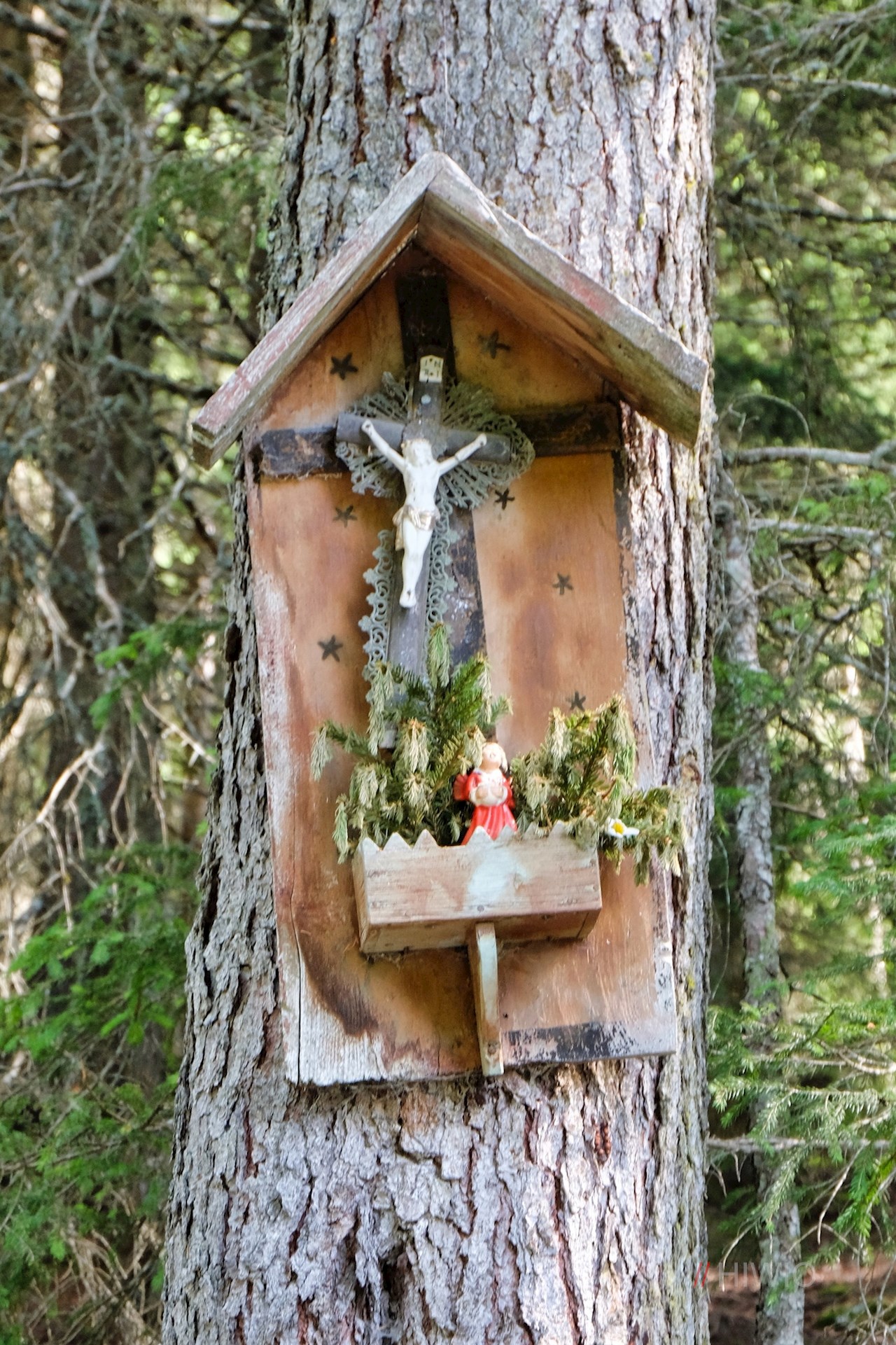 Der Beschilderung Nr. 5 in Richtung Telfer Almen bzw. Freundalm folgend, wandert man auf der asphaltierten Höfestraße zum eigentlichen Beginn des Wanderweges an einer kleinen Holzbrücke hoch. Hier finden sich eventuell weitere Parkmöglichkeiten.