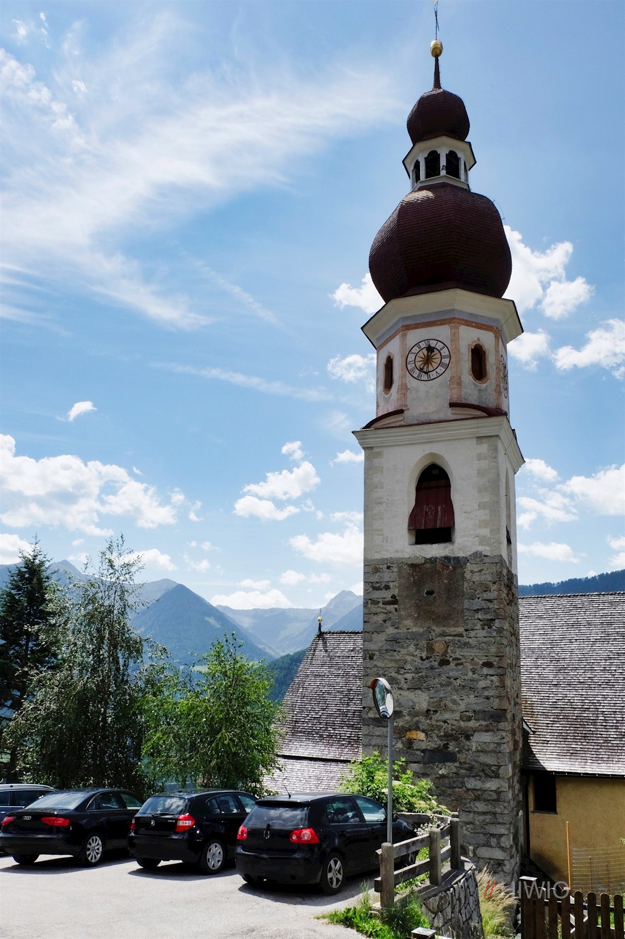 Die Wanderung zur Freundalm nimmt in Obertelfes bei Sterzing ihren Anfang. Neben der Dorfkirche finden sich einige Parkmöglichkeiten.