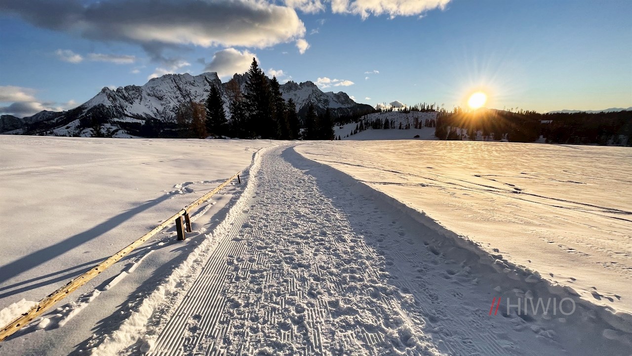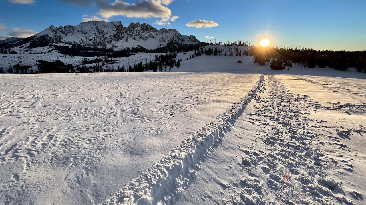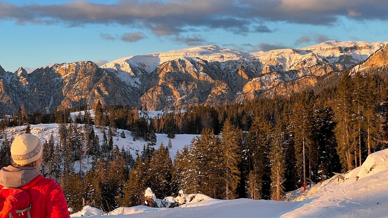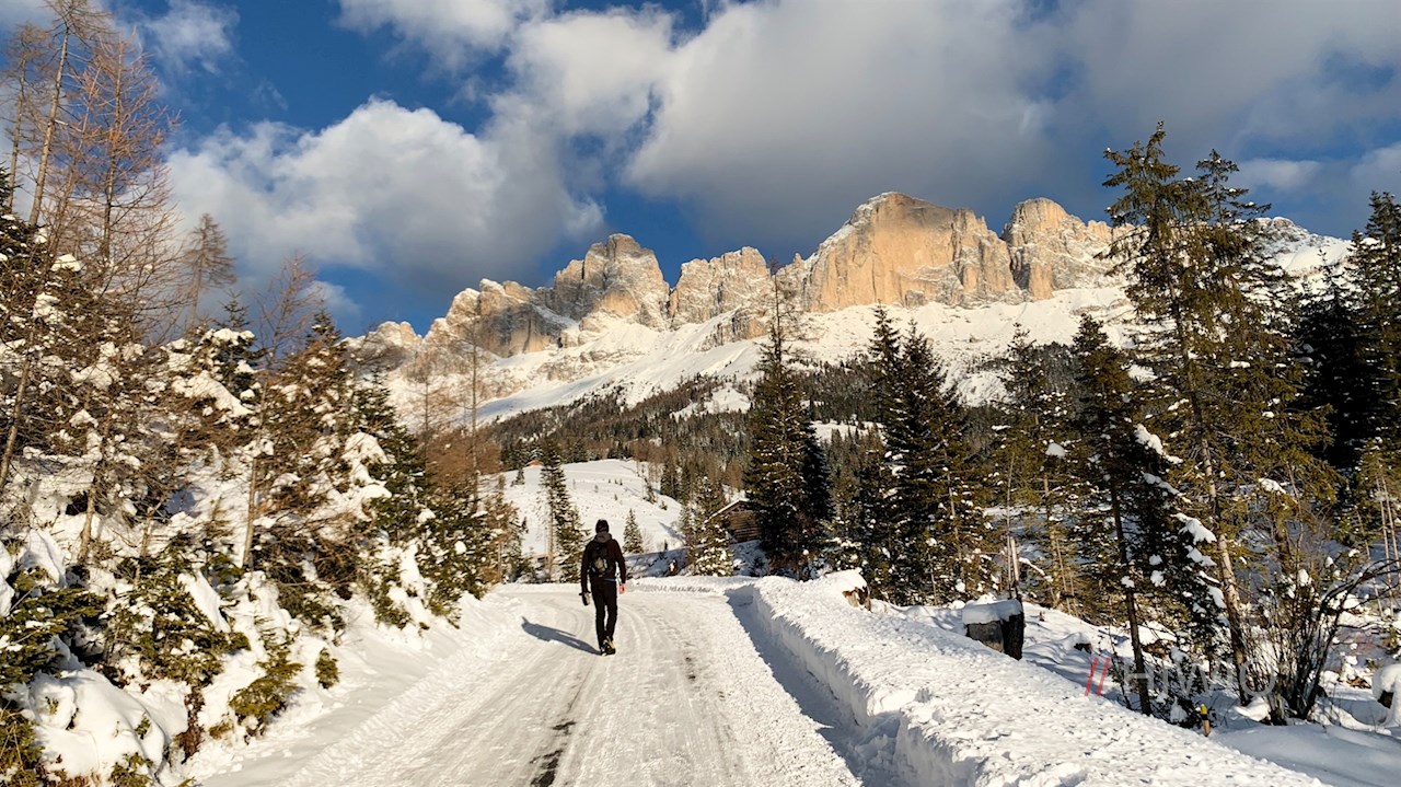 Dieser schlängelt sich im sanften Anstieg durch schneebedeckte Wiesen und lichte Waldstücke und öffnet dabei malerische Ausblicke auf die majestätischen Felsen des Rosengarten und des Latemar.