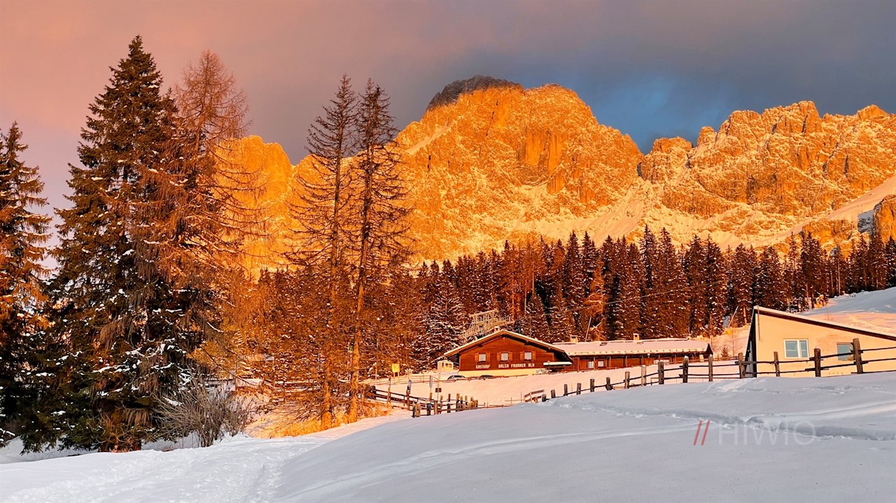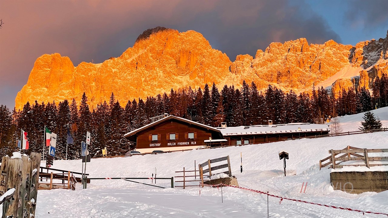 Zuletzt zweigt rechts der Weg Nr. 15 zur nunmehr nahen Frommer Alm ab. Vor der Kulisse des rot leuchtenden Rosengarten sorgen die freundlichen Wirtsleute auch im Winter für das leibliche Wohl ihrer Gäste.
