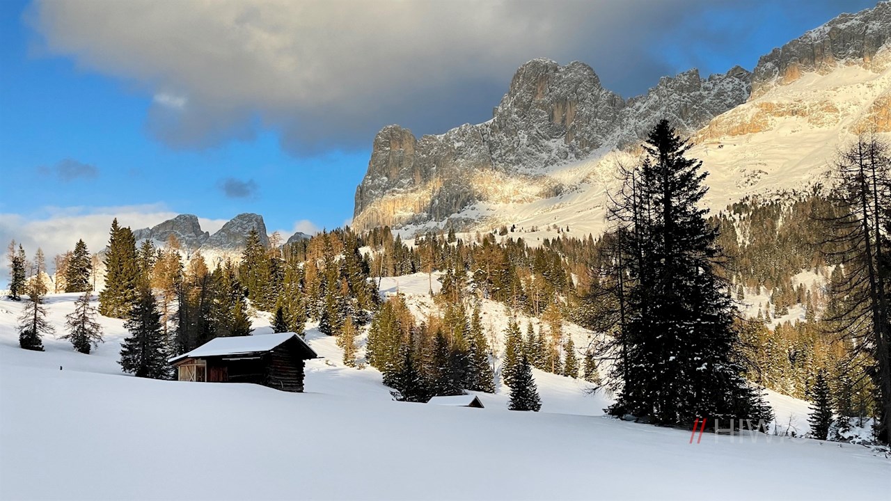 Die Frommer Alm am Fuße des Rosengarten ist auch im Winter ein beliebtes Wanderziel: Wenn sich eine glitzernde Schneedecke über das Eggental gelegt hat, zieht sich ein gebahnter Winterwanderweg mit Blick auf die umliegenden Dolomiten vom Karersee zur einladenden Frommer Alm.