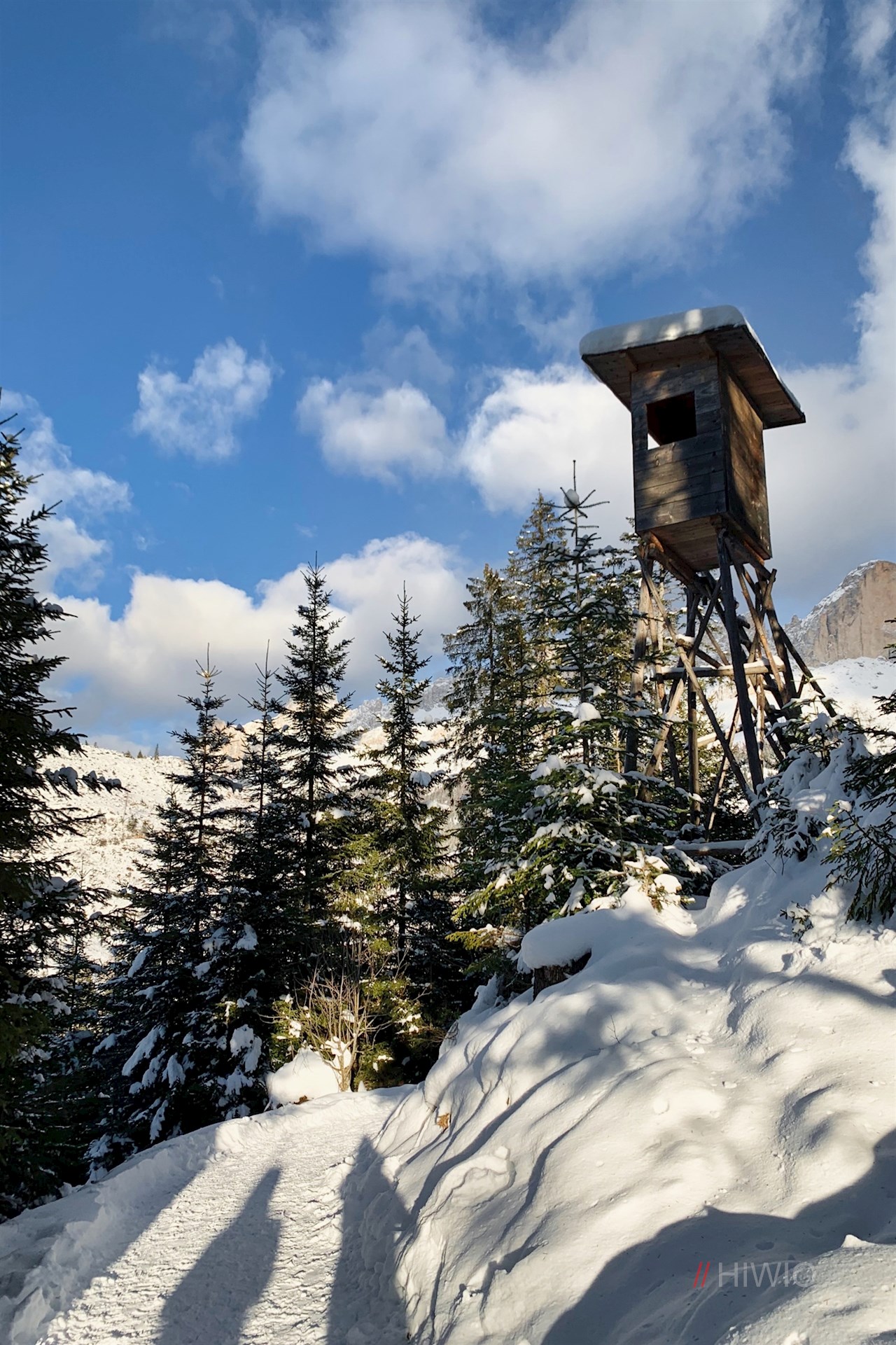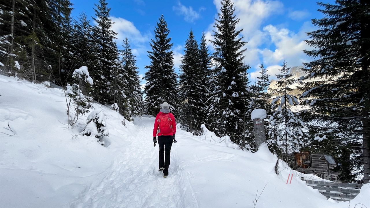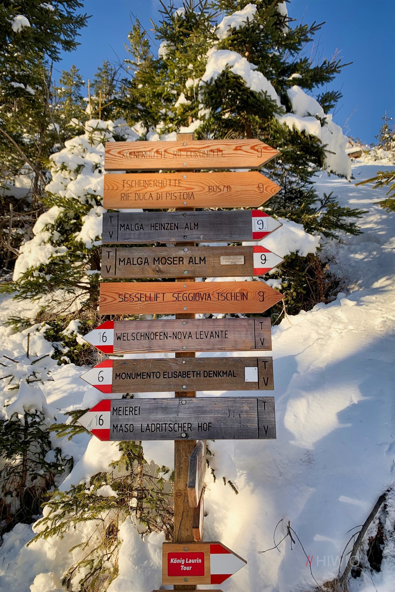 Am Parkplatz weist das Wanderschild Nr. 6 den gebahnten Winterwanderweg in Richtung Heinzenalm. Er führt zunächst auf einer spektakulären Hängebrücke über den Welschnofener Bach und zieht sich dann durch ein winterliches Waldstück und schneebedeckte Wiesen zur nächsten Weggabelung.