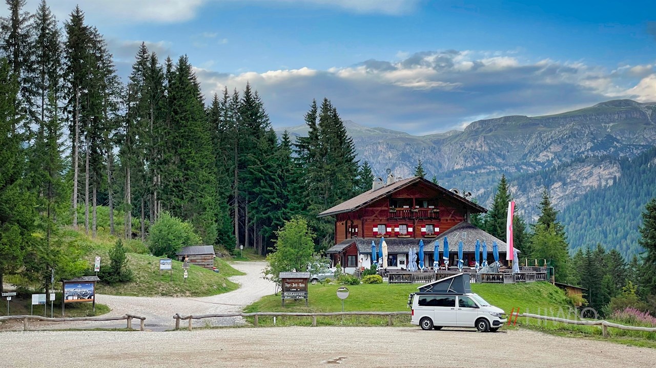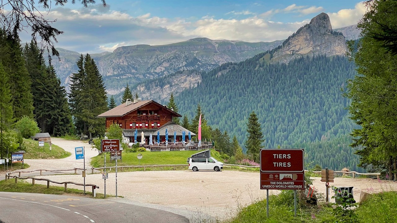 Die Wanderung zur Frommeralm beginnt auf dem großen Wanderparkplatz auf dem Nigerpass, der das Tierser Tal mit dem Eggental verbindet.