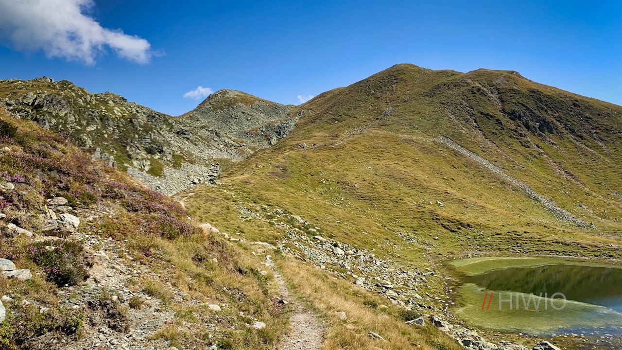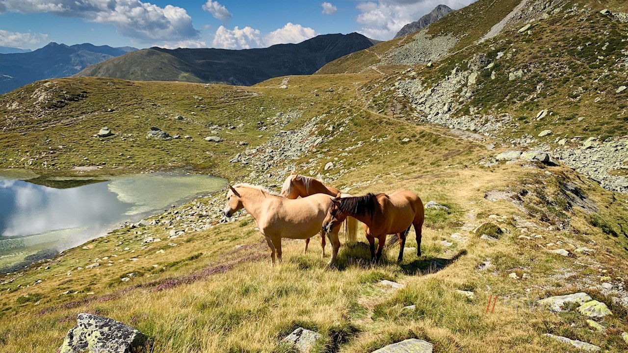 Vom Gänsekragen fällt der markierte Steig über sanfte Grashänge und Blockwerk zum idyllischen, in eine Mulde gebetteten Penser-Joch-See ab, an dessen Ufern während der Sommermonate zumeist Pferde weiden.