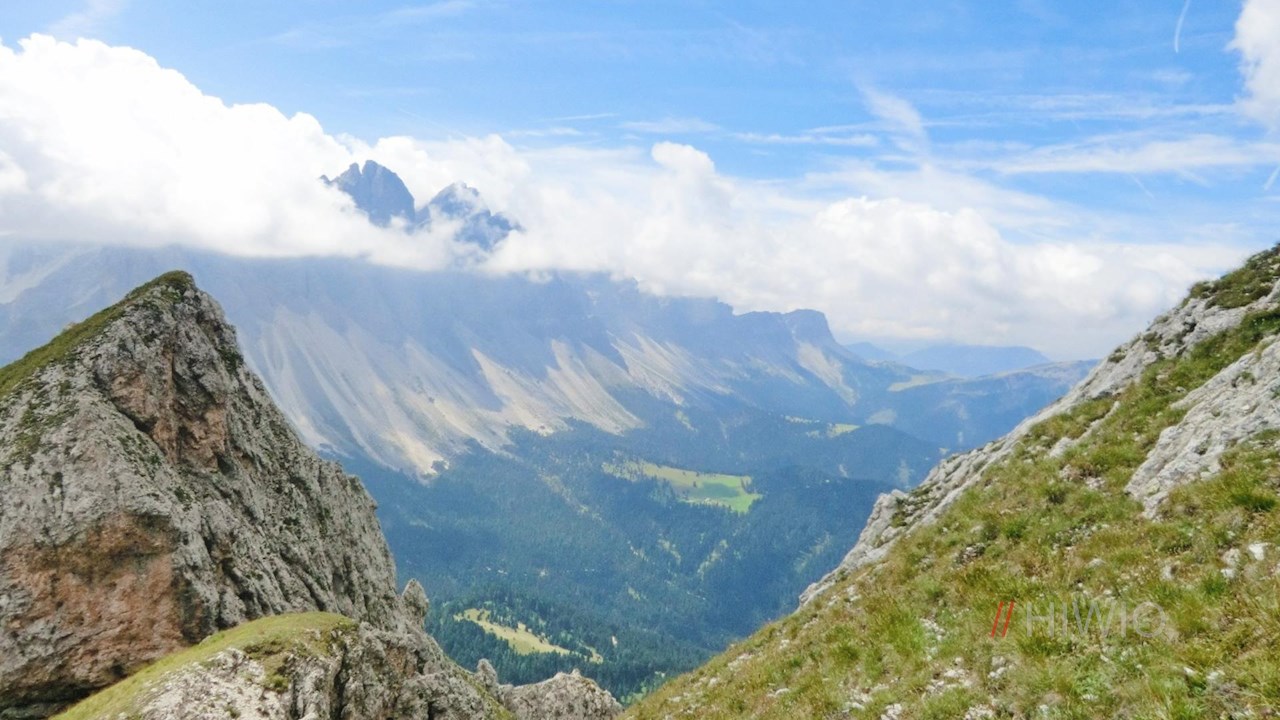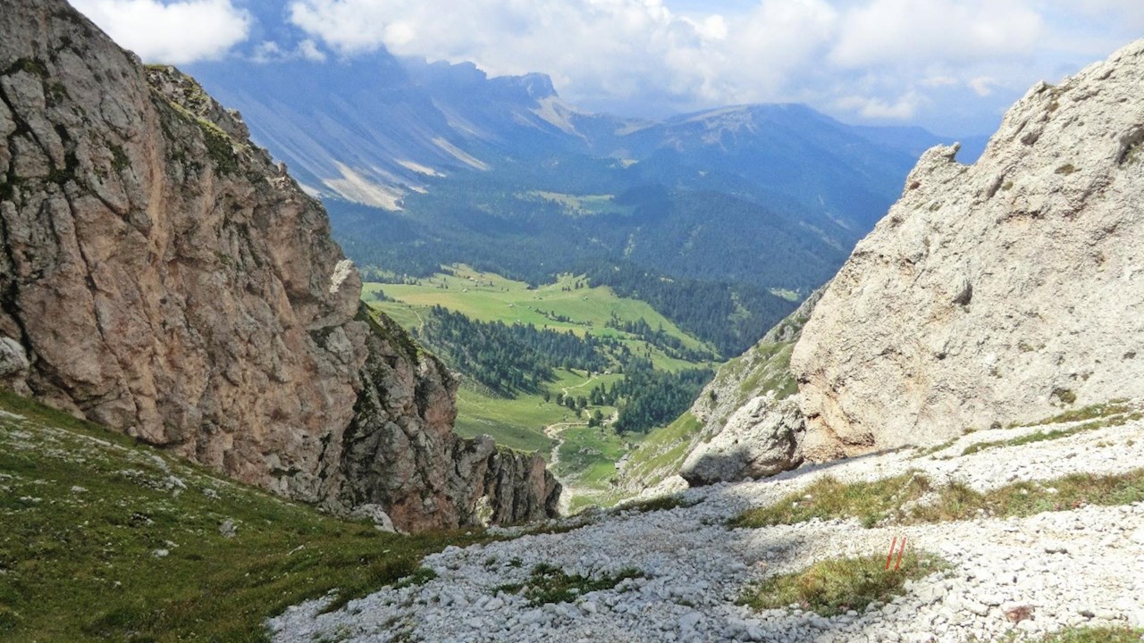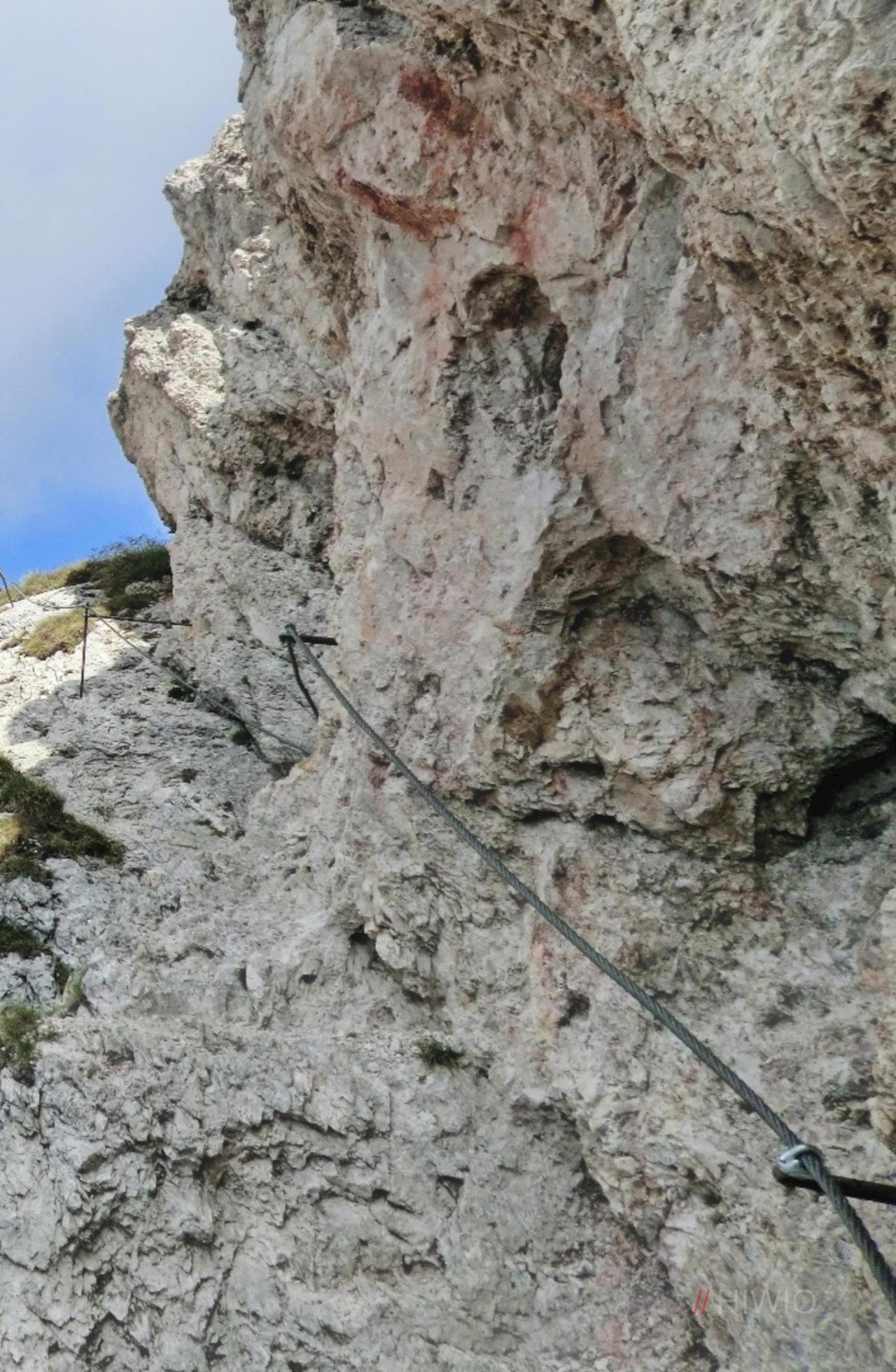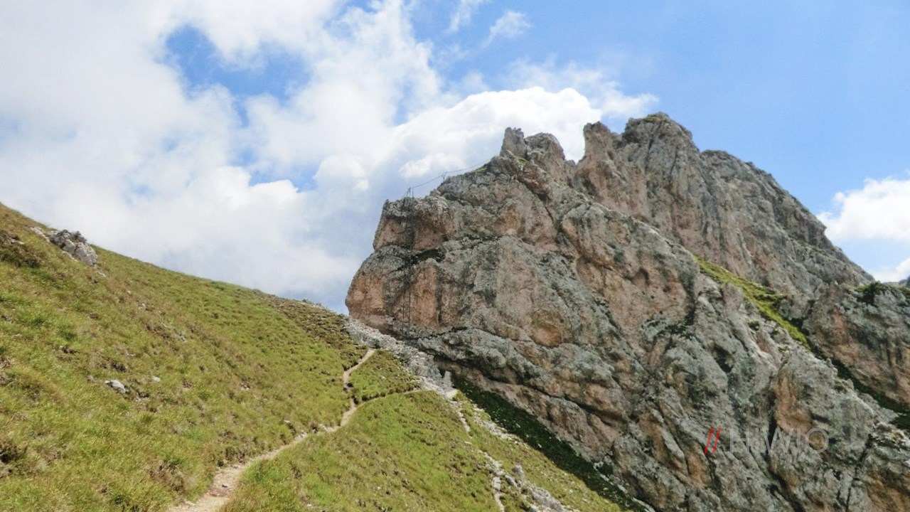 Über Almwiesen tritt man so in das karge, von Geröll- und Wiesenpfaden geprägte Reich der Aferer Geisler ein. Nun beginnt der teilweise gesicherte Teil der Wanderung, der über einige ausgesetzte Passagen führt und mit kurzen Kletterpartien über teils schroffe und abfallende Felswände aufwartet.