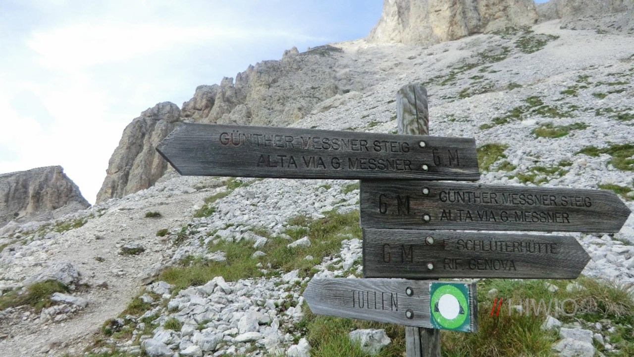 Oben angekommen, folgt man zunächst dem Weg Nr. 4. Alsbald zweigt links der Günther-Messner-Steig ab, der durchgängig mit dem Kürzel GM markiert ist.