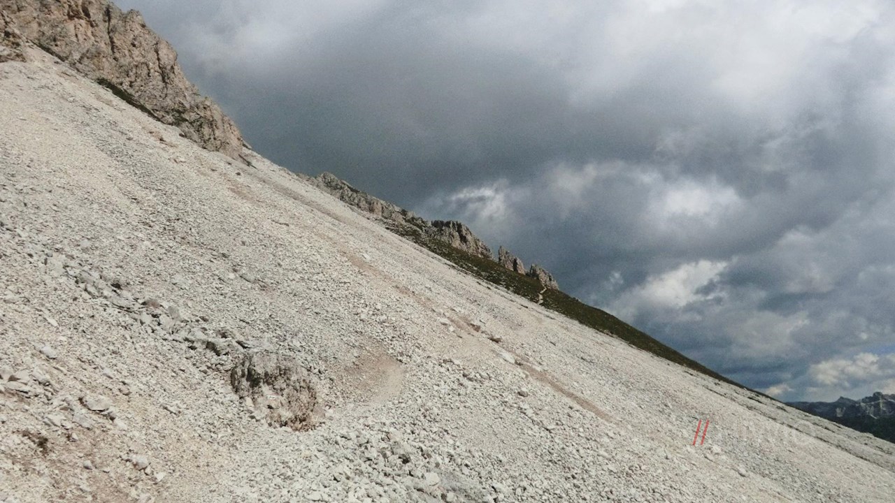 Schließlich zweigt rechts der teils gesicherte Schotterpfad zum Tullen, der höchsten Erhebung der Aferer Geisler, ab. Wer mag, kann einen kurzen Abstecher auf diesen machen, andernfalls setzt man die Wanderung auf dem Pfad Nr. 25 fort.