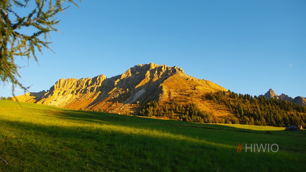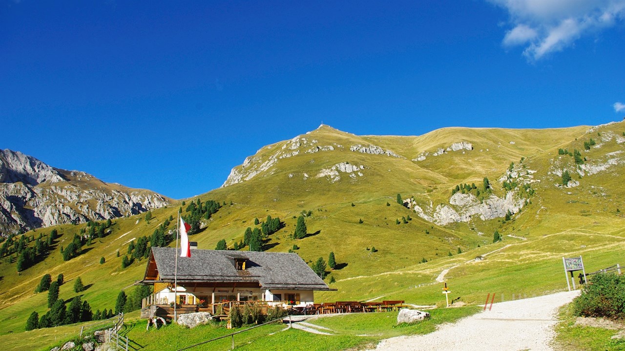 Von der Gampenalm sind die Schlüterhütte und der dahinter aufragende Zendleser Kofel nicht mehr fern. Auf Letzterem entfaltet sich ein ungemein weitreichendes Panorama.