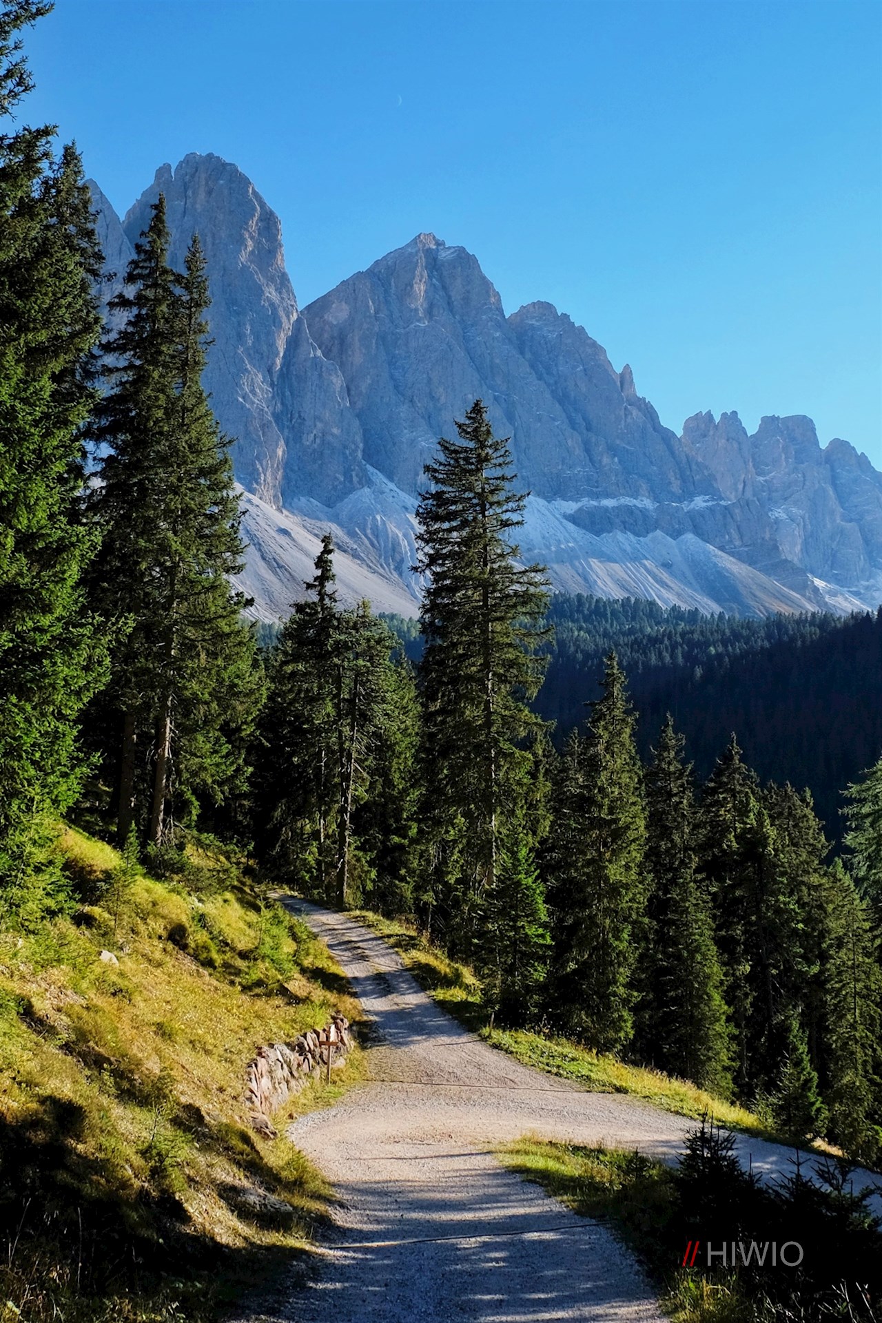 Die Wanderung zur Gampenalm beginnt auf dem gebührenpflichtigen Wanderparkplatz Zans im Villnösser Talschluss. Stets der Wegnummer 33 in Richtung Gampenalm folgend, führt der breite, angenehm ansteigende Wanderweg zunächst durch den lichten Wald, der ab und an verträumte Ausblicke auf die nahen Geislerspitzen, die Seceda und die Raschötz freigibt.