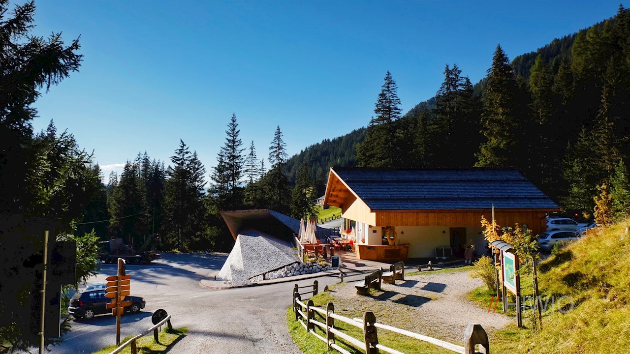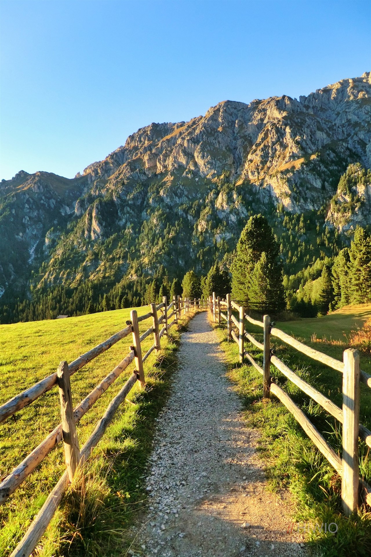 Hinter der Waldgrenze öffnen sich die weitläufigen, von den Villnösser Geislern umrahmten Gampenwiesen. Vor der Kulisse des Zendleser Kofel führt der Weg nun im etwas steileren Anstieg zur Gampenalm, auf deren Sonnenterrasse man neben den liebevoll zubereiteten Gerichten auch die schöne Aussicht ins Villnösstal genießen kann.