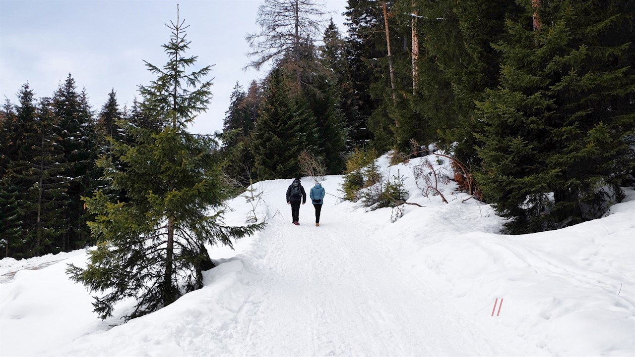 Direkt am Parkplatz zweigt der breite Wanderweg Nr. 7 in Richtung Gasserhütte ab. Er führt im angenehmen Anstieg durch den stillen, unter einer weißen Schneedecke ruhenden Winterwald.