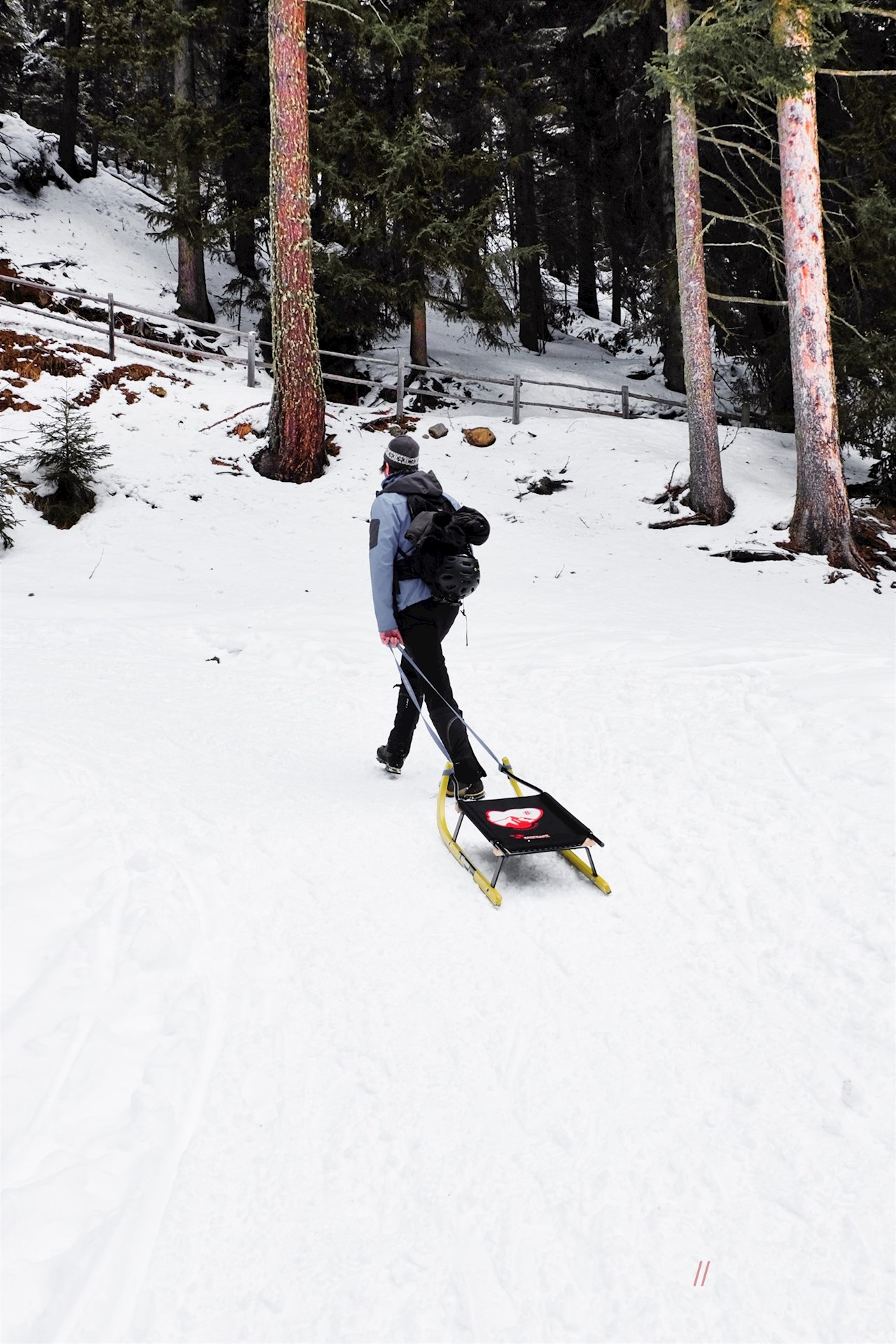 Auf die Einkehr folgt für die Rodler der schwungvollste Teil der Wanderung: die Abfahrt auf dem gut gebahnten Hinweg, der zugleich als Rodelbahn genutzt wird.