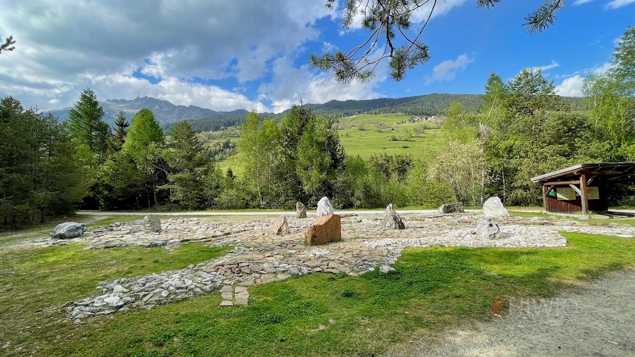 Kurz vor Stange zweigt am rechten Wegesrand der Weg Nr. 2B zum nahen Steingarten ab. Hier formen Steine eine Karte Südtirols, auf der Felsblöcke unterschiedlichen Gesteins ihr Vorkommen im Land markieren.