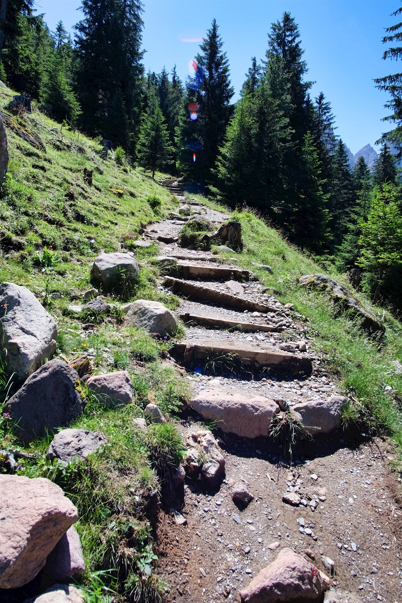 Der Wegnummer 36 in Richtung Geisleralm/Dusler Alm folgend, taucht der anfangs breite Wanderweg sogleich in einen Wald ein, durch den er zunächst leicht absteigt. Wenig später geht er in einen schmalen Waldsteig über. Er führt im angenehmen Anstieg zur urigen Dusler Alm am Fuße des Sass Rigais. Auf etwa halbem Wege lädt sie zur gemütlichen Zwischenrast.
