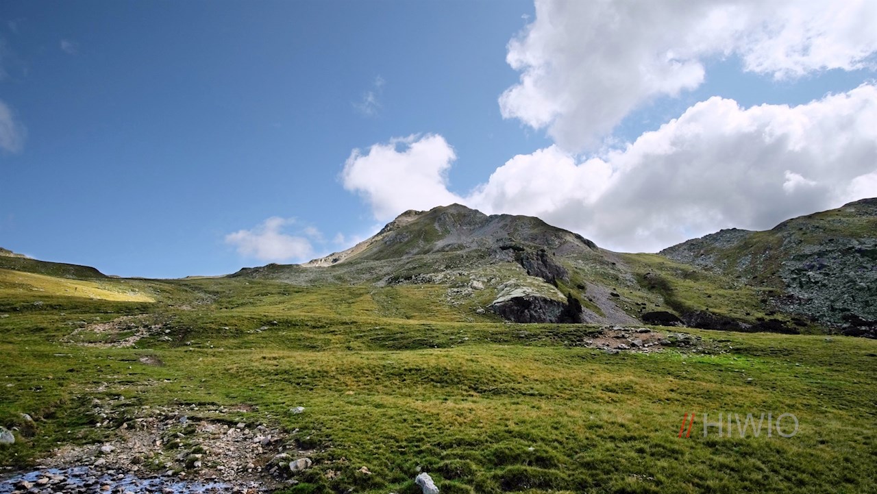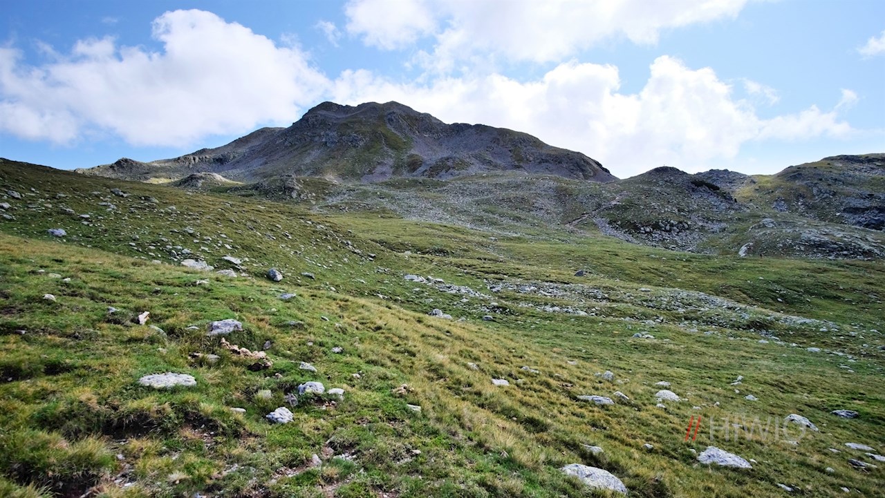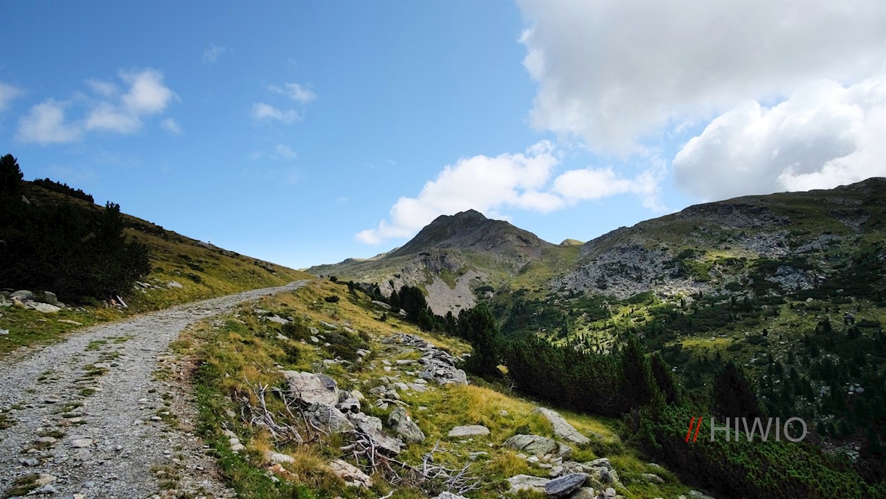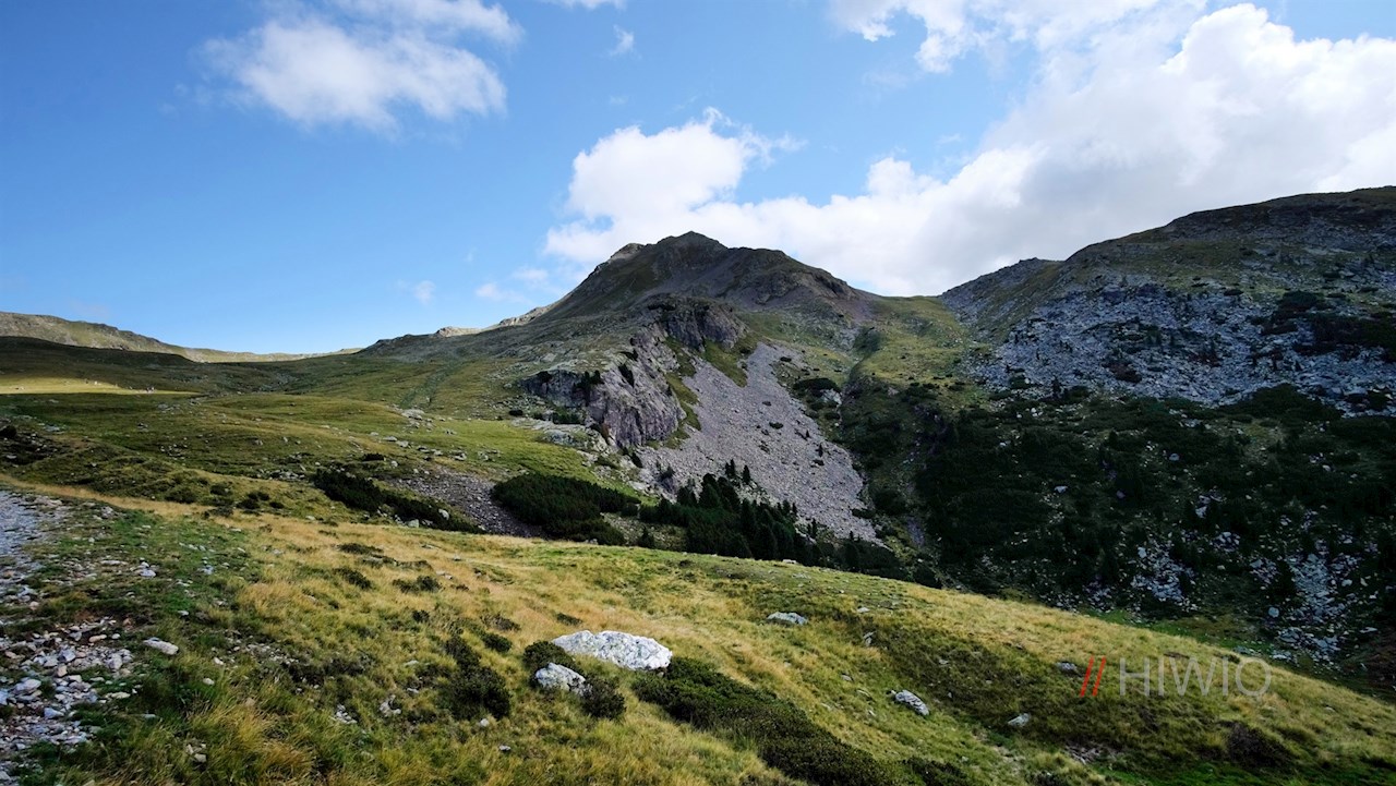 Hinter der Getrumalm steigt der Weg Nr. 7/8A mit Blick auf die rechts aufragende Kassianspitze in Richtung Getrumsee an.