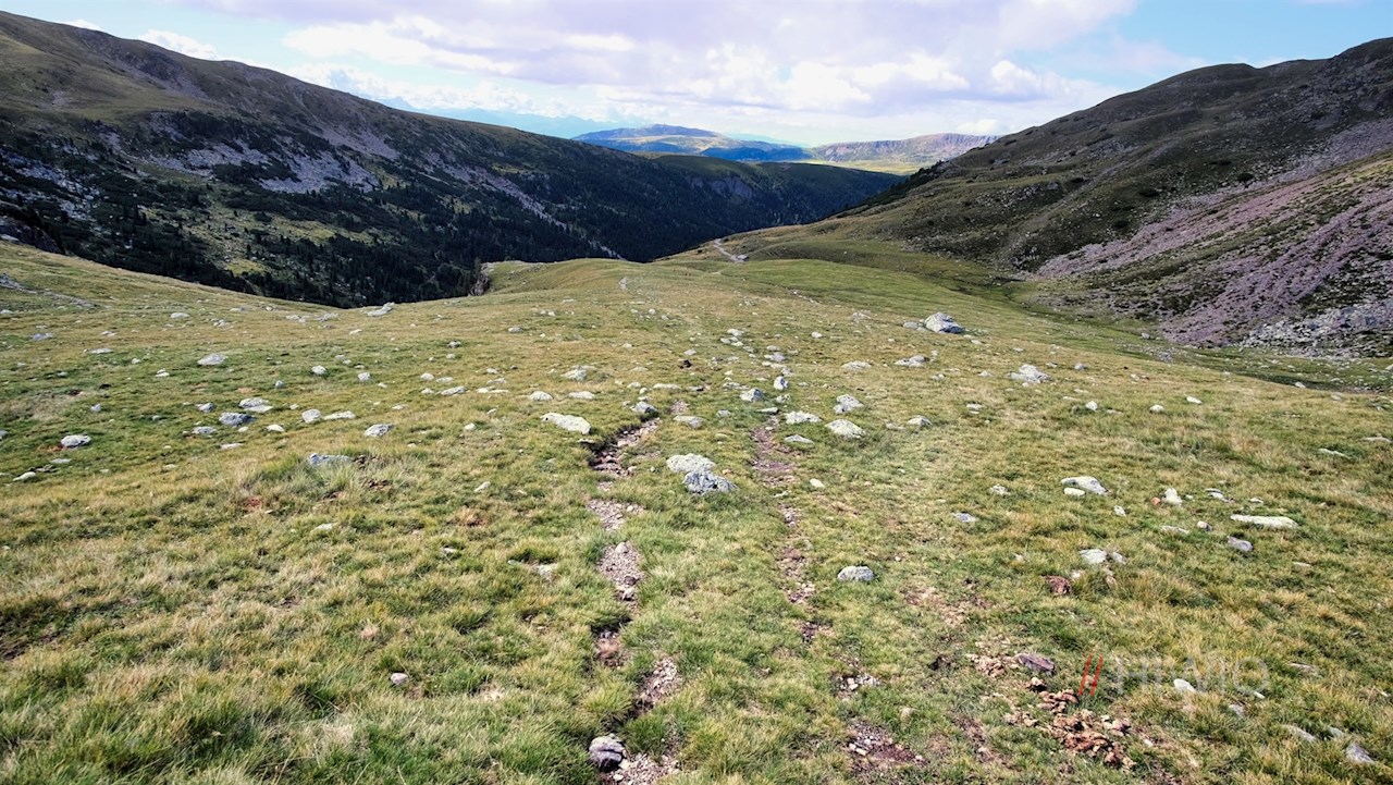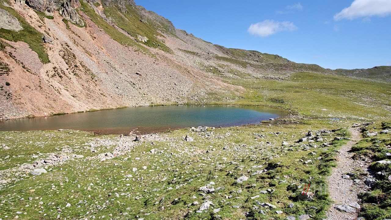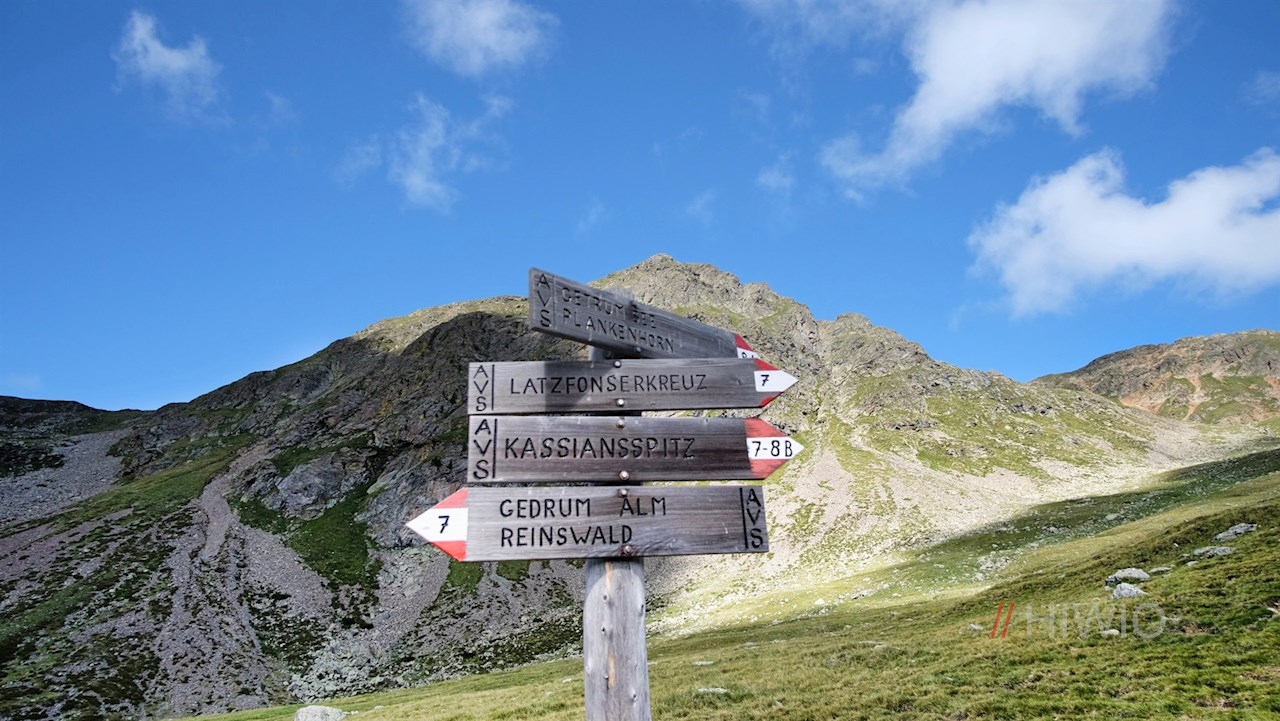 Wenig später gelangt man an eine Weggabelung, an der rechts der Weg zum Latzfonser Kreuz und zur Kassianspitze abzweigt. Wir aber folgen dem links abzweigenden Steig Nr. 8A, der sich durch die steinbeschlagenen Grashänge zum nahen Getrumsee windet.