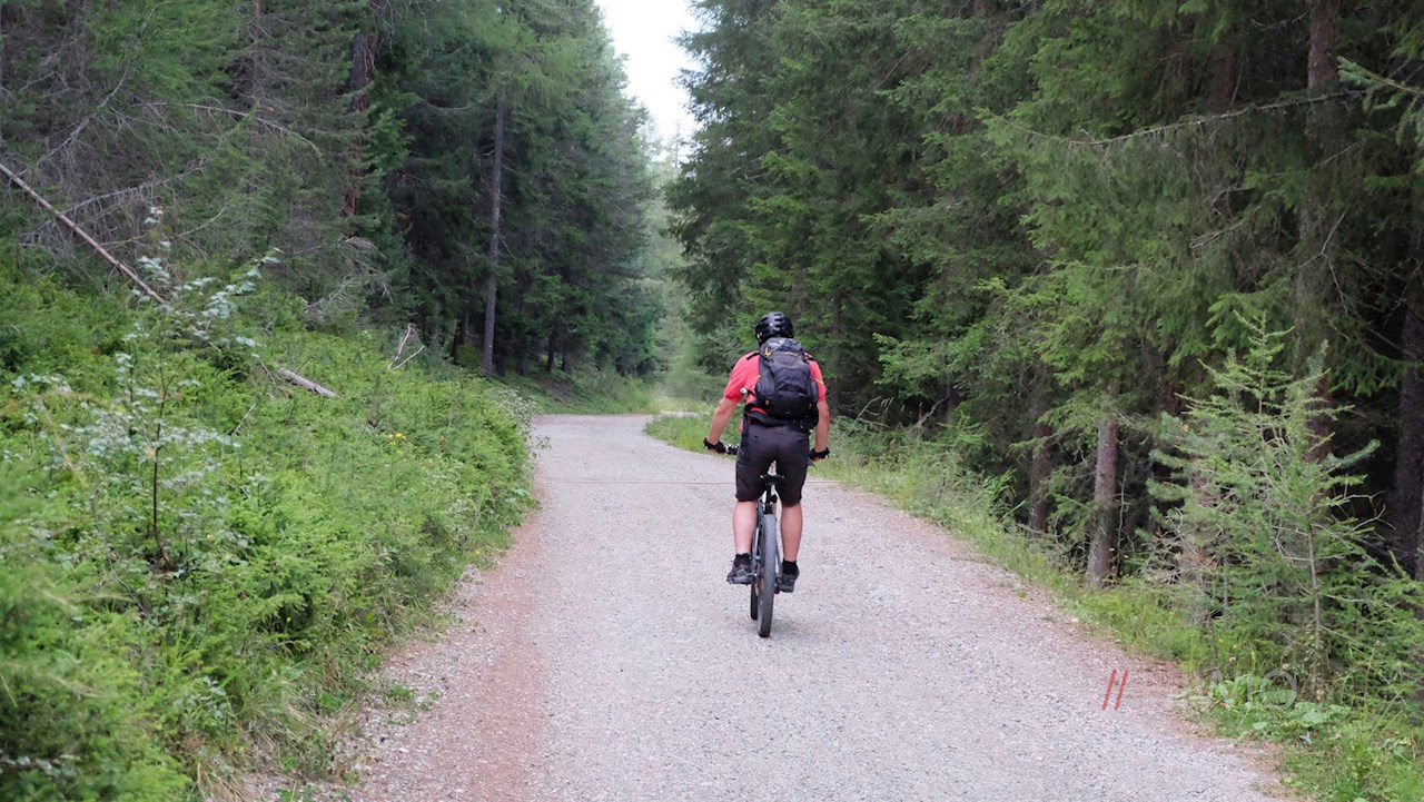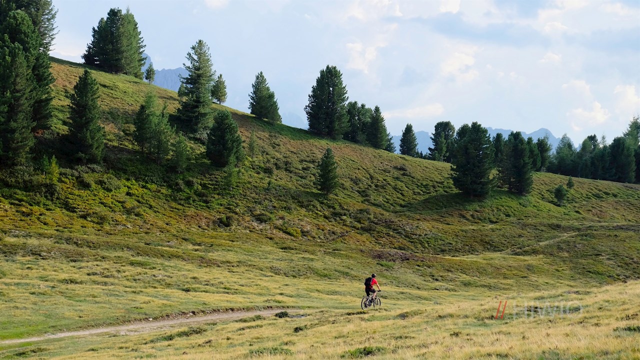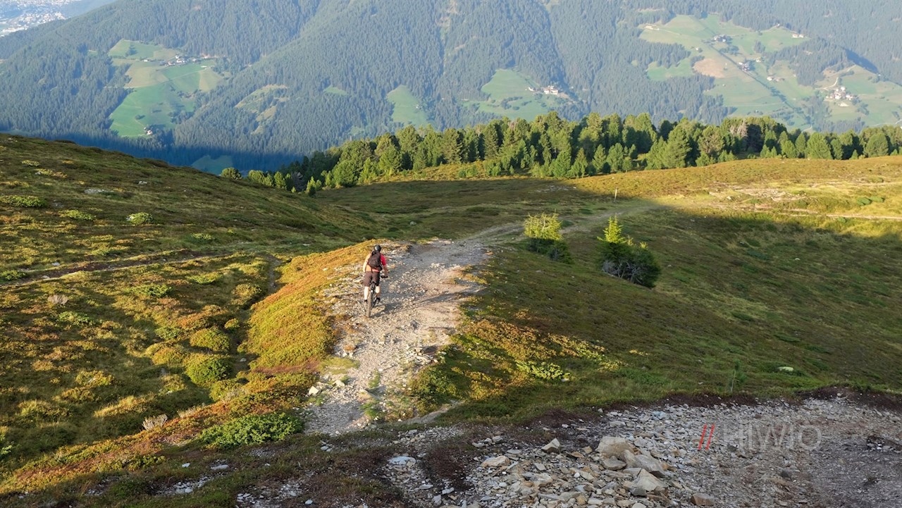 Vom Col da Lech gleitet man in einem flowigen Single-Trail zu den nunmehr nahen Glittner Seen hinab, auf dessen Wassern ein Holzschiff und zwei Schwäne schwimmen. Diese und das malerische Panorama verleihen den Glittner Seen ihren ganz besonderen Liebreiz.