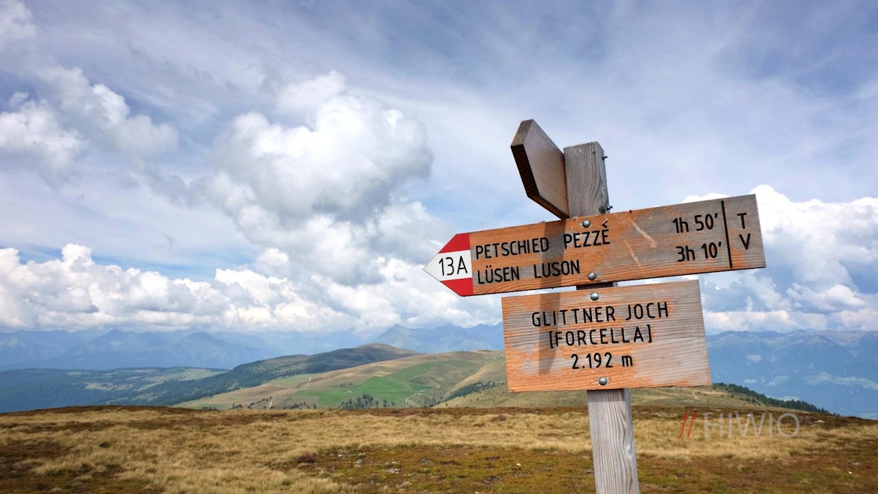 Auf dem Rückweg von den Glittner Seen schlägt man den Weg Nr. 13A ein. Er führt zunächst auf das nördlich gelegene Glittner Joch und mündet schließlich in den Weg Nr. 10, der auf die Straße nach Oberflitt hinabführt.