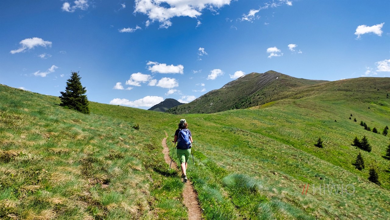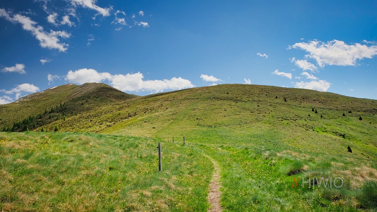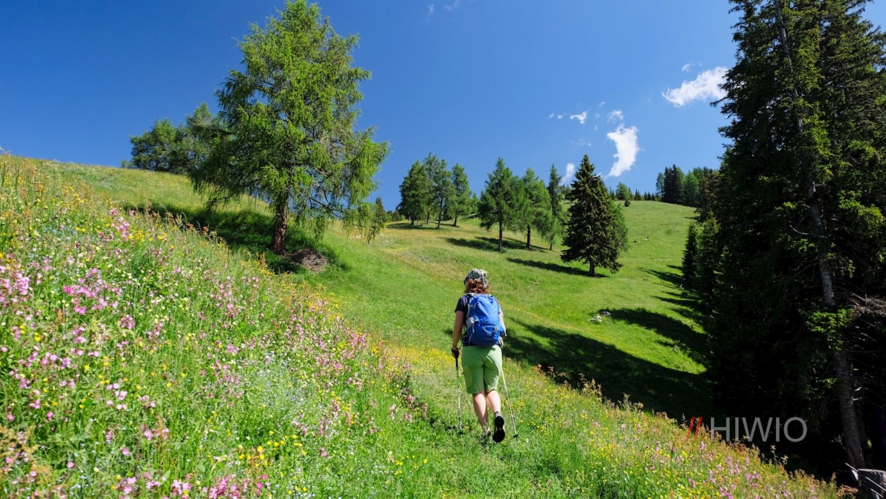 Er schlängelt sich im sanften Anstieg durch den Wald, hinter dem sich malerische Lärchenwiesen ausdehnen. Während sie sich im Frühsommer in ein farbenfrohes Blumenmeer verwandeln, leuchten die sonnenliebenden Lärchen im Herbst im schönsten Goldgelb.