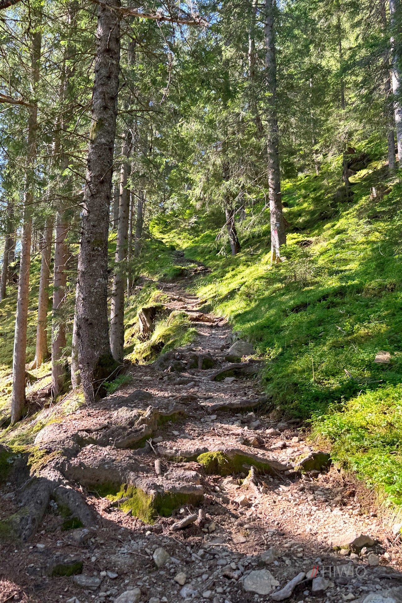 Der Wegnummer 6A Richtung Grente Alm folgend, schlängelt sich der schmale, teils wurzel- und steinbeschlagene Waldsteig im ziemlich steilen Anstieg zur oberen Waldgrenze.