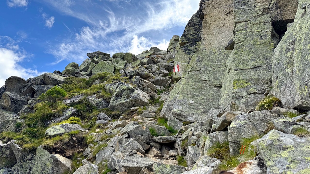 Nun folgt der wohl anspruchsvollste Abschnitt der Wanderung, der ein gewisses Maß an Trittsicherheit und Schwindelfreiheit voraussetzt: der Aufstieg über die steile Gipfelflanke. Er führt über gesicherte Holztreppen, teils seilversicherte Felsstufen und -blöcke und zuletzt über Blockwerk zum formschönen Gipfelkreuz.