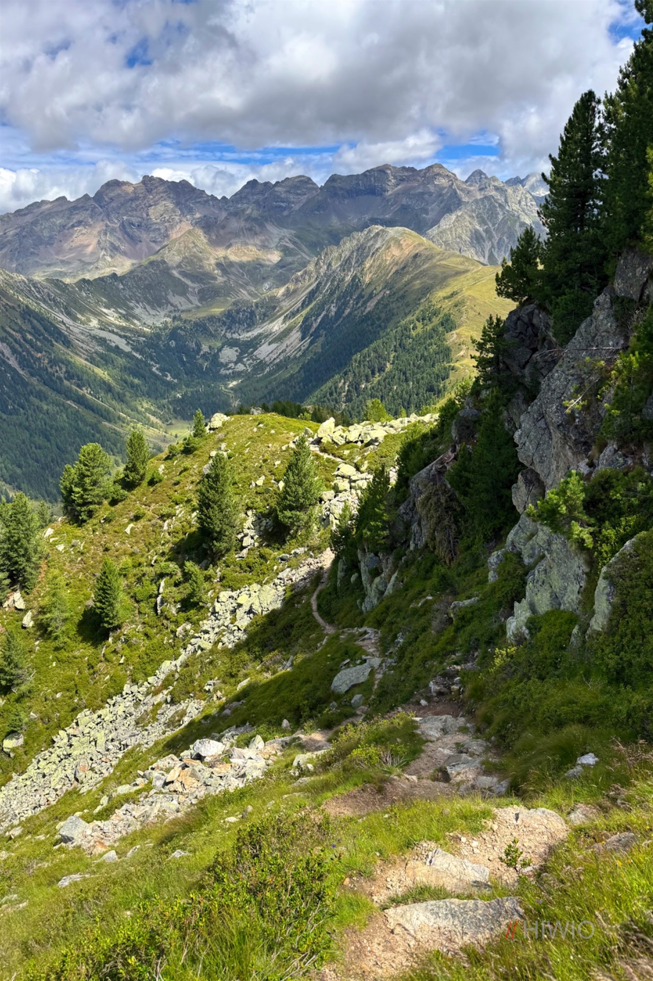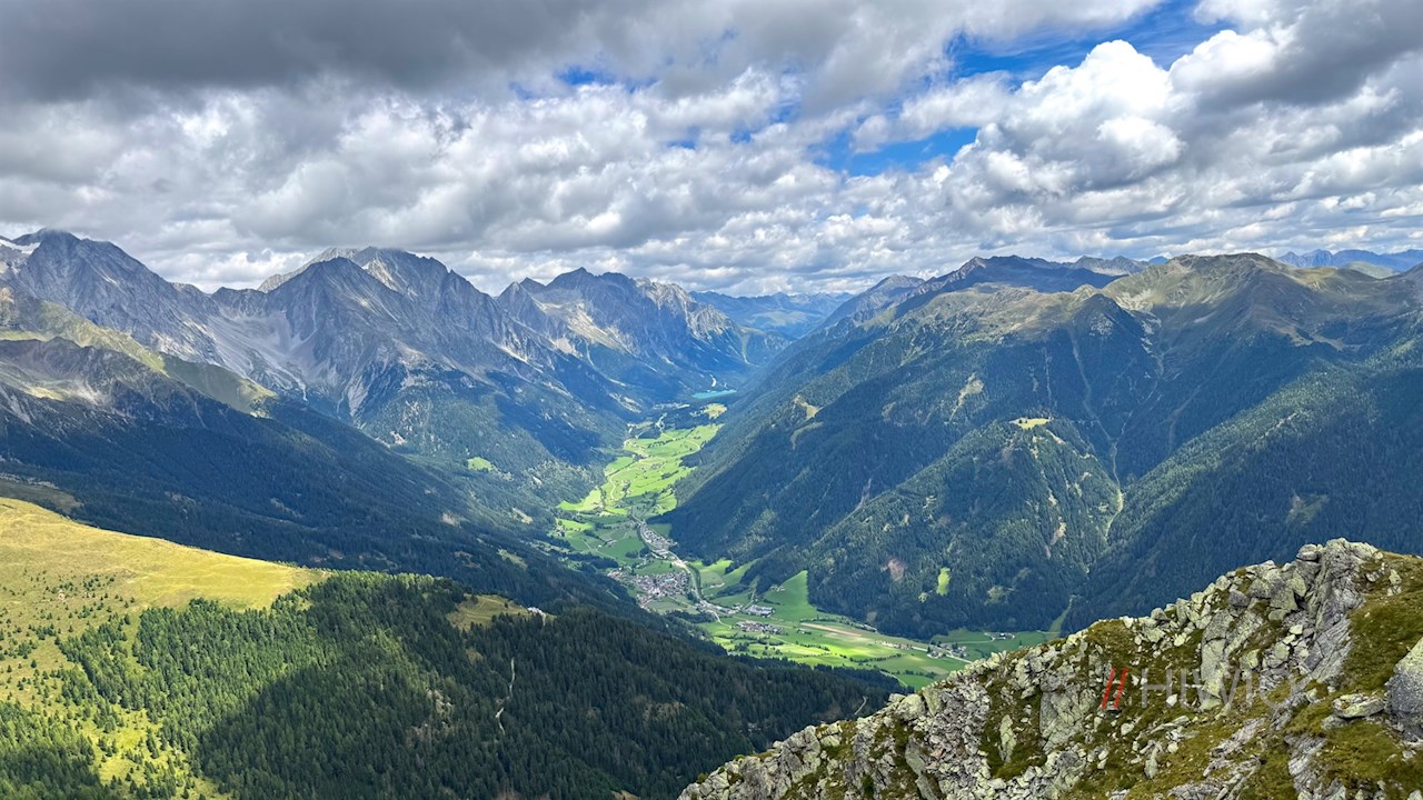 Auf knapp 2.500 m Höhe öffnet sich schließlich ein atemberaubender Weitblick auf die zahlreichen umliegenden Gipfel, von denen insbesondere die mächtigen Dreitausender der Rieserfernergruppe und die bleichen Dolomiten ins Auge stechen. Zu unseren Füßen breiten sich indes das Pustertal und das Antholzer Tal aus.