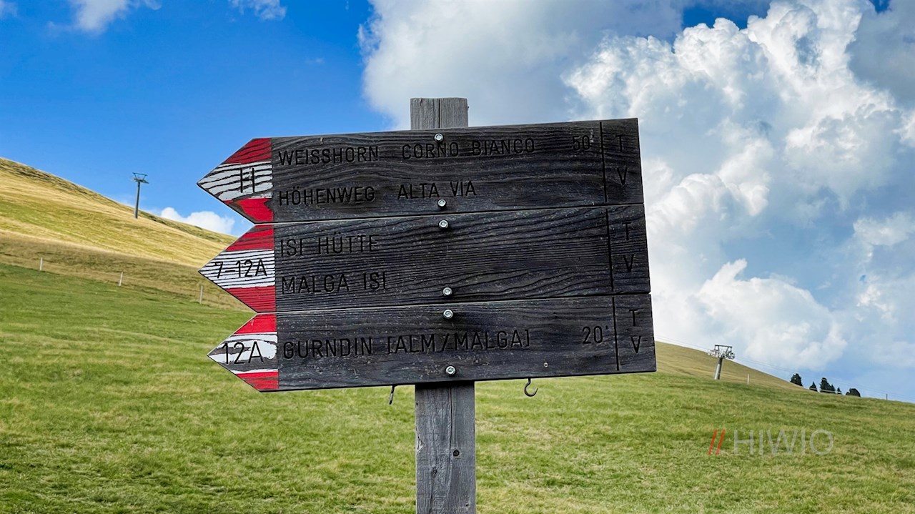 Dem Wegweiser Nr. 12 in Richtung Gurndinalm folgend, quert der breite Wanderweg die sanften Weidewiesen am Fuße des Weißhorn, in denen sich schöne Ausblicke entfalten.