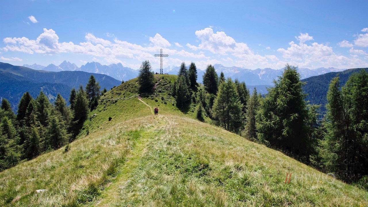 Neben dessen imposantem Gipfelkreuz entfaltet sich ein ungeahnt weitreichender Ausblick ins langgezogene Gsieser Tal, auf die umliegende Gsieser Bergwelt und auf bekannte Dolomiten wie den Haunold oder den Dürrenstein.