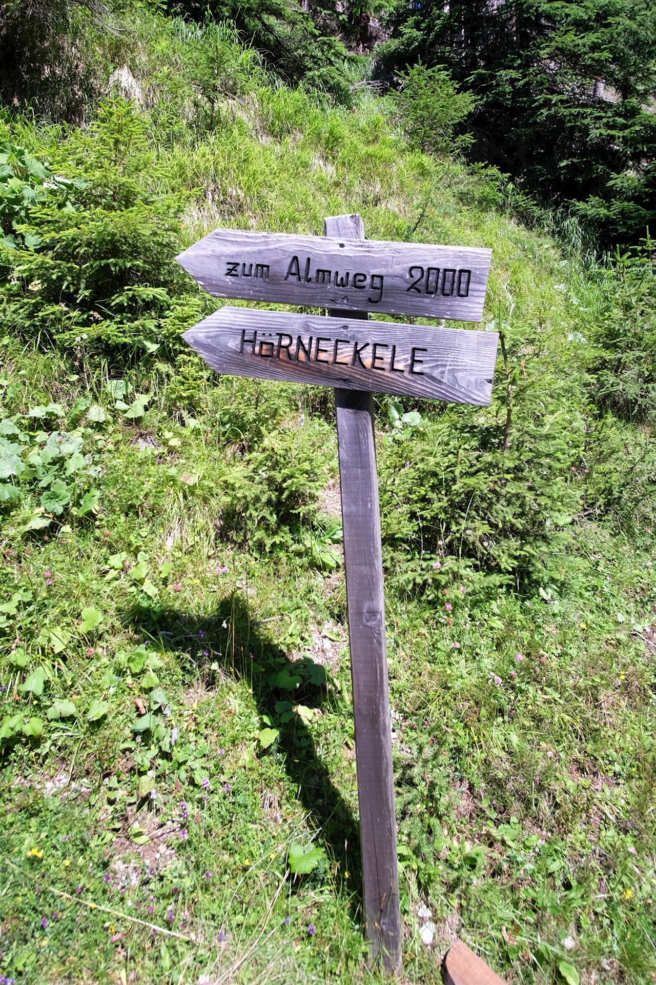 Nach etwa einer Stunde sanften Wanderns erreicht man die idyllisch gelegene Schäferalm, bei welcher der anfangs breite Wanderweg Nr. 52 in Richtung Hörneggele abzweigt. Er führt im angenehmen Anstieg durch den Wald und geht schließlich in einen links abzweigenden Wald- und Wiesensteig über. Zuletzt steigt er durch aussichtsreiche Bergwiesen auf das 2.130 m hohe Hörneggele an.