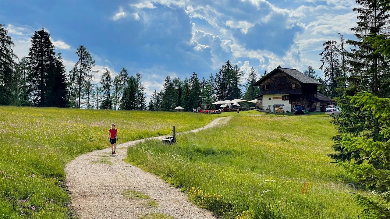 Nach einer Viertelstunde sanften Wanderns erreicht man die schindelbedeckte, von sanften Almwiesen und steil aufragenden Felswänden umrahmte Heinzenalm, in der die Wanderer mit verführerisch duftenden Südtiroler Gaumenfreuden verwöhnt werden. Während sich die Erwachsenen entspannt zurücklehnen und die einzigartige Atmosphäre am Fuße des Rosengarten genießen, können sich die Kinder auch in den Almwiesen und auf dem hütteneigenen Spielplatz austoben.