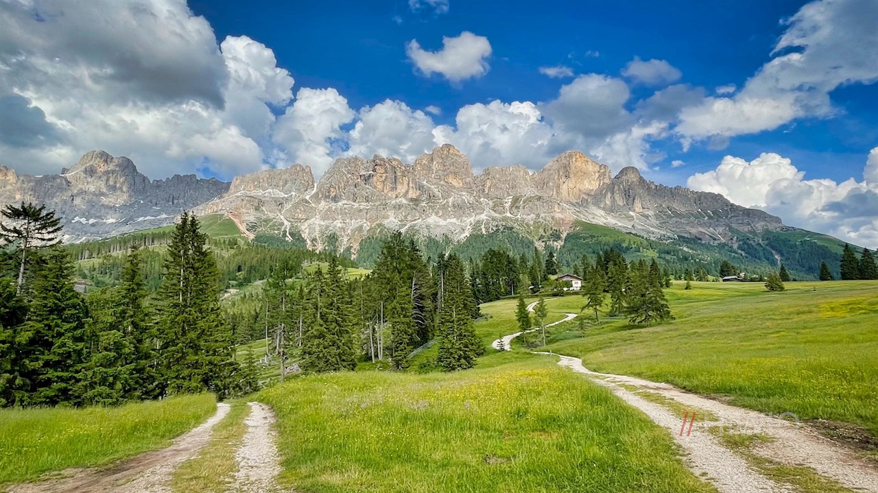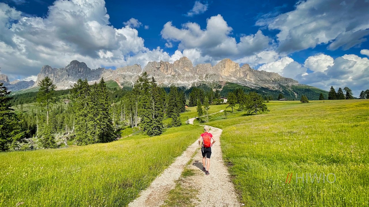 Noch bezaubernder aber ist der Blick auf die dahinter aufragenden Felswände des zackenreichen Latemar und des sagenumwobenen Rosengarten, die den Wanderer sogleich in ihren Bann ziehen.