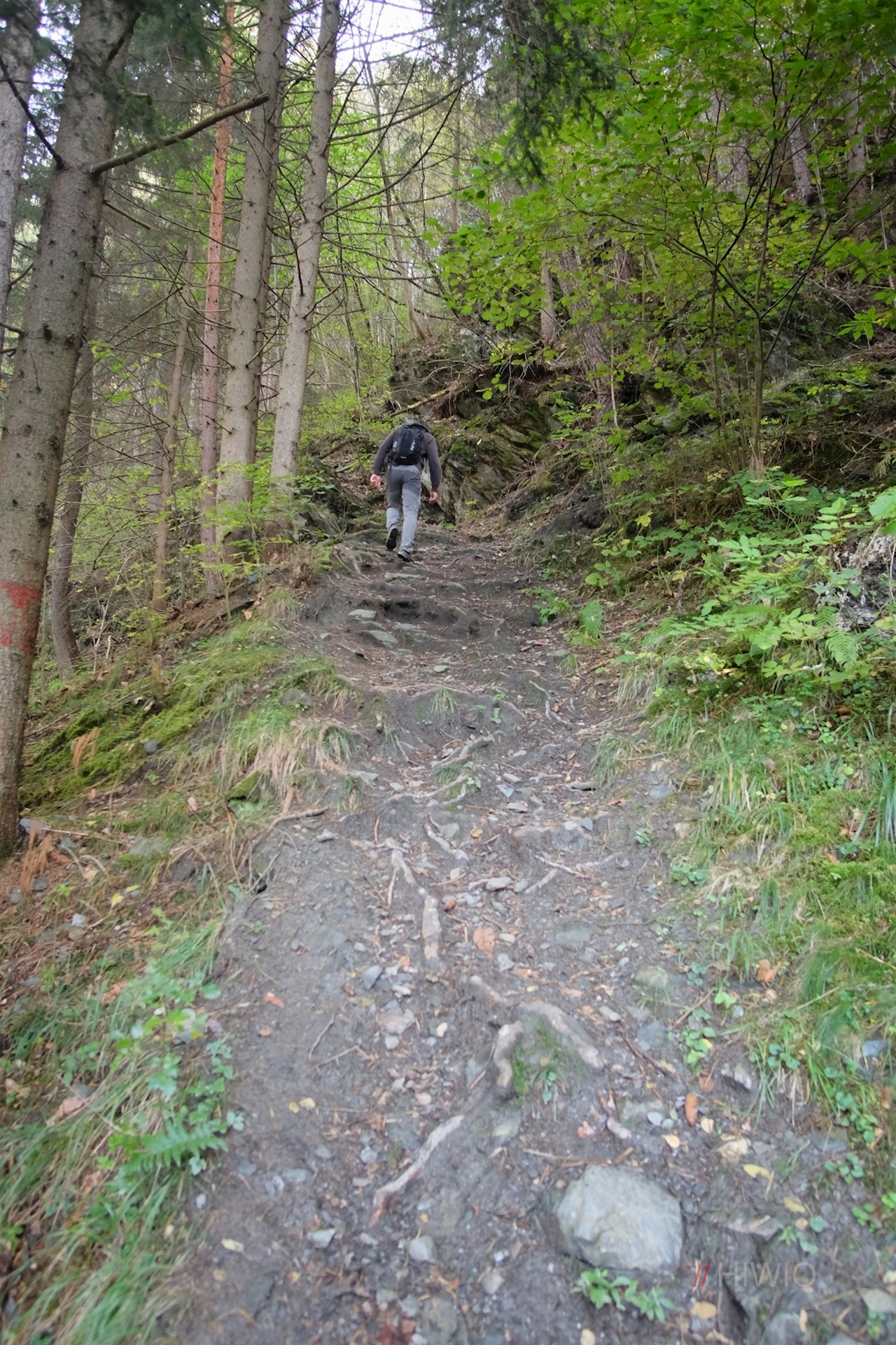 Am Ende der Karlspromenade folgt man kurz dem Weg Nr. 7/8 in Richtung Mellaun/Klerant, von dem wenig später der Waldsteig nach St. Andrä abzweigt. Dieser steigt ziemlich steil durch den stein- und wurzelbeschlagenen Wald an.