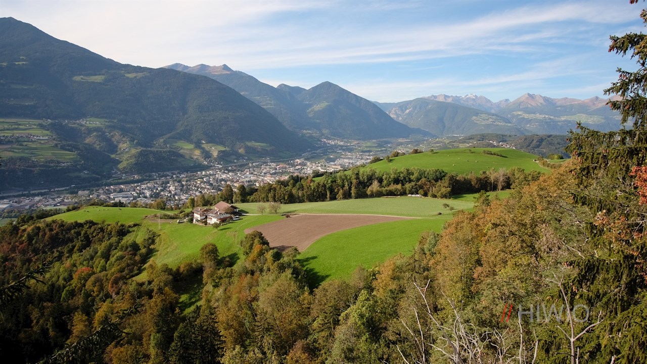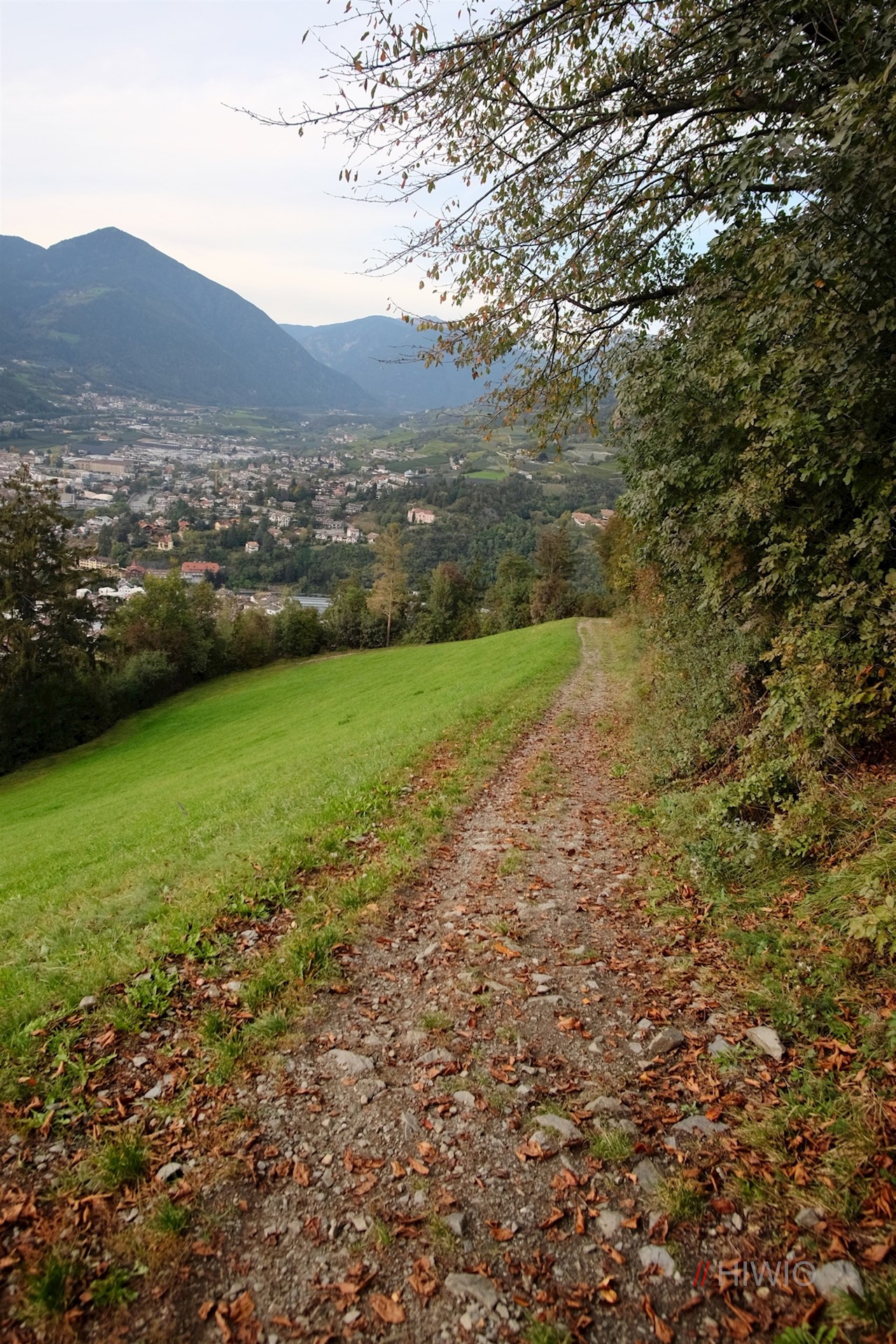 Nachdem man die Rienz auf der Widmannbrücke überquert hat, folgt man der Köstlaner Straße, die im sanften Anstieg durch den gleichnamigen Stadtteil führt. Hinter den letzten Häuserreihen weist am linken Straßenrand ein Schild den Weg auf die Karlspromenade.