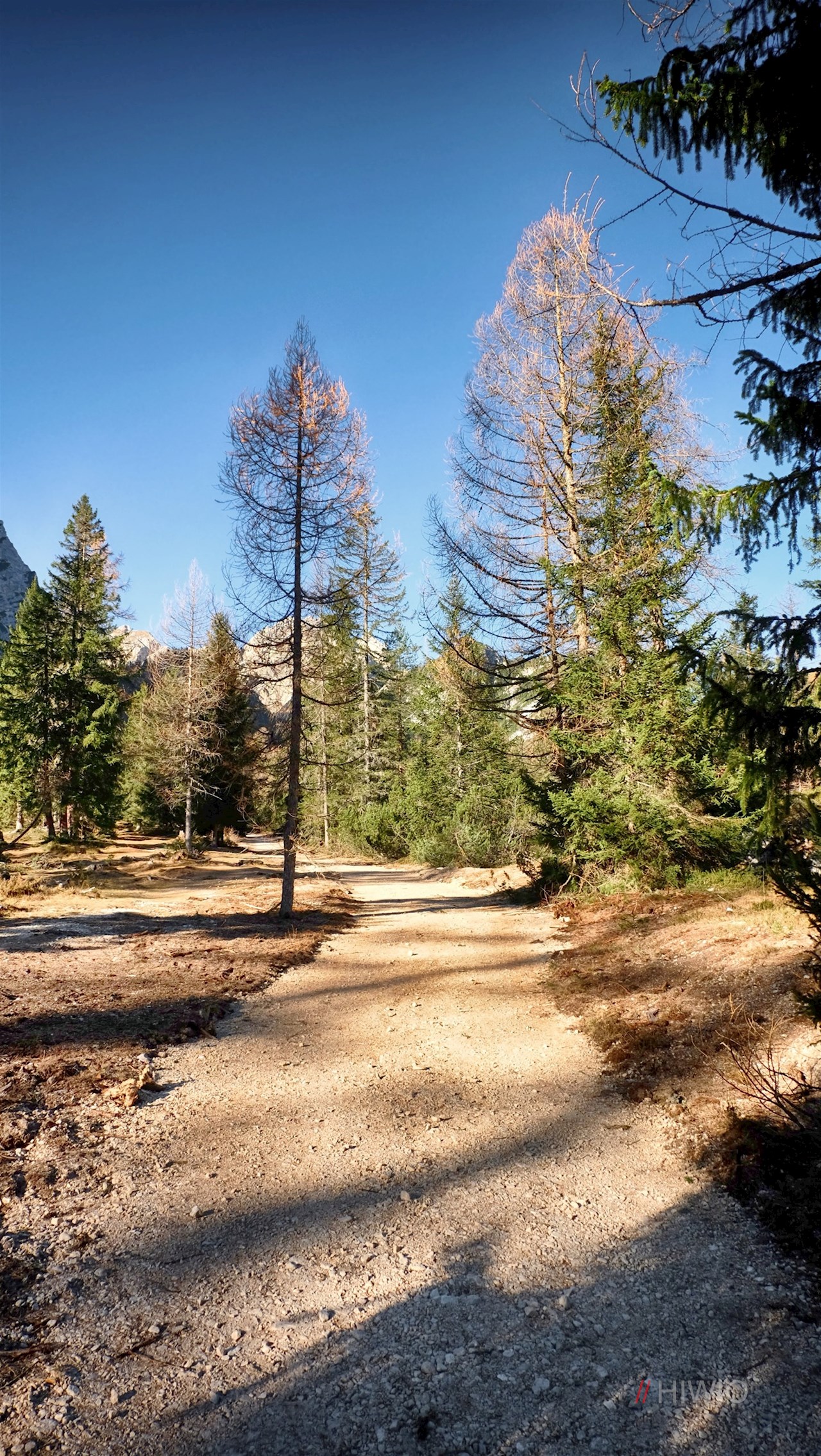 Am namhaften Grandhotel folgt man dem rechts abzweigenden Weg, der am westlichen Seeufer des wildromantischen Pragser Wildsees entlangführt.