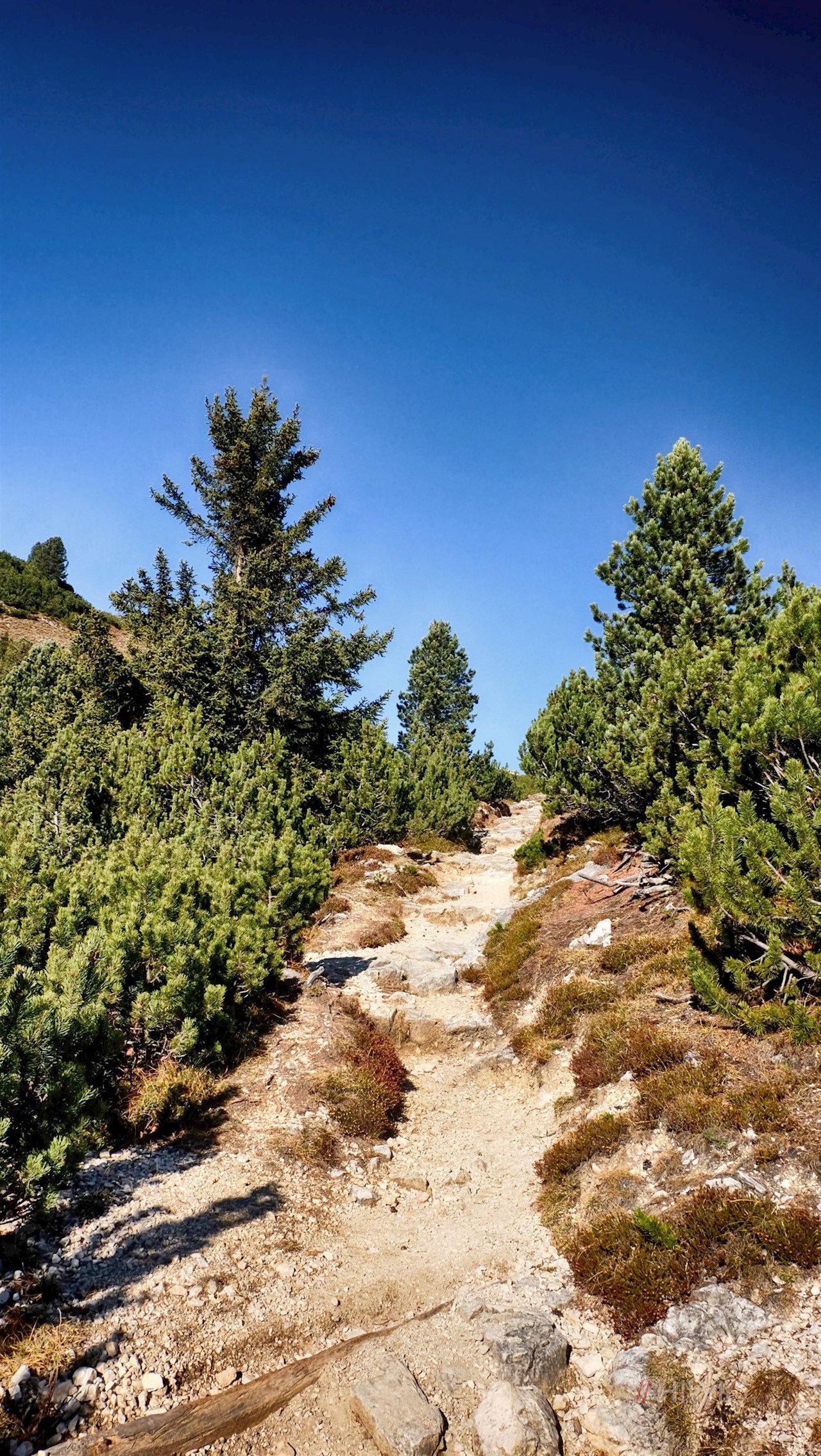 Dahinter windet sich der nunmehr schmale Pfad Nr. 19 ziemlich steil durch einen lichten, friedvollen Nadelwald.