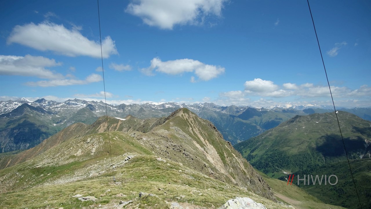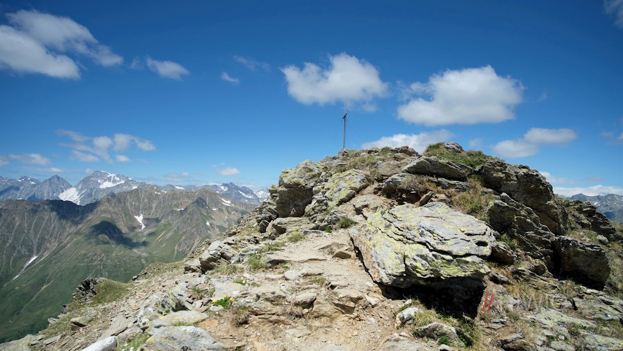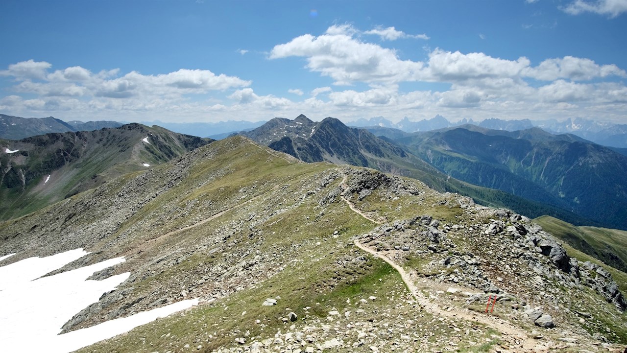 Dieser geht später in den Weg Nr. 12 über, der sich über die nunmehr steinigeren Grashänge an den lauschigen Pfoiseen und der dahinter liegenden Pfoischarte vorbei zum stattlichen Gipfelkreuz der aussichtsreichen Hochkreuzspitze emporschlängelt. Auf 2.739 m Höhe erschließt sich hier ein atemberaubender Ausblick auf die Villgratner Berge, die Rieserfernergruppe und die bleichen Dolomiten mit den weltberühmten Drei Zinnen.