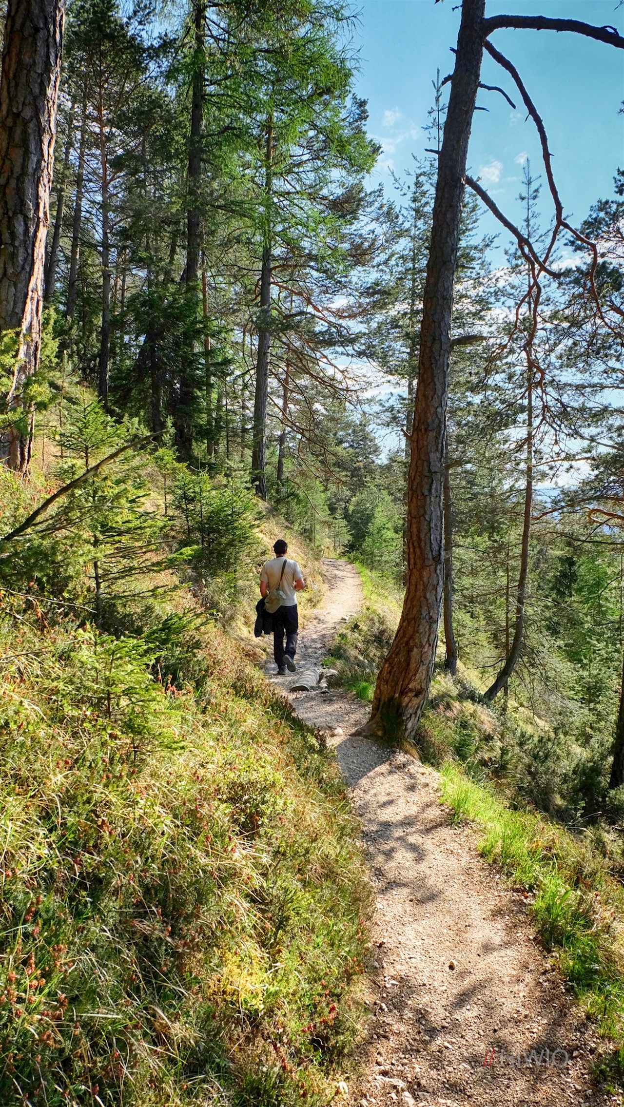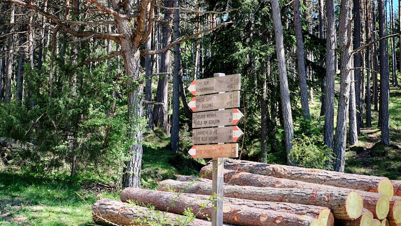 Nach wenigen Gehminuten erreicht man eine Weggabelung: Links zweigt der breite und gemütlichere Forstweg, rechts der etwas steilere, dafür aber kürzere Waldweg ab. Beide führen zur familienfreundlichen Tuffalm, die inmitten einer weitläufigen Liegewiese zu Füßen des Schlern zur genüsslichen Einkehr lädt.