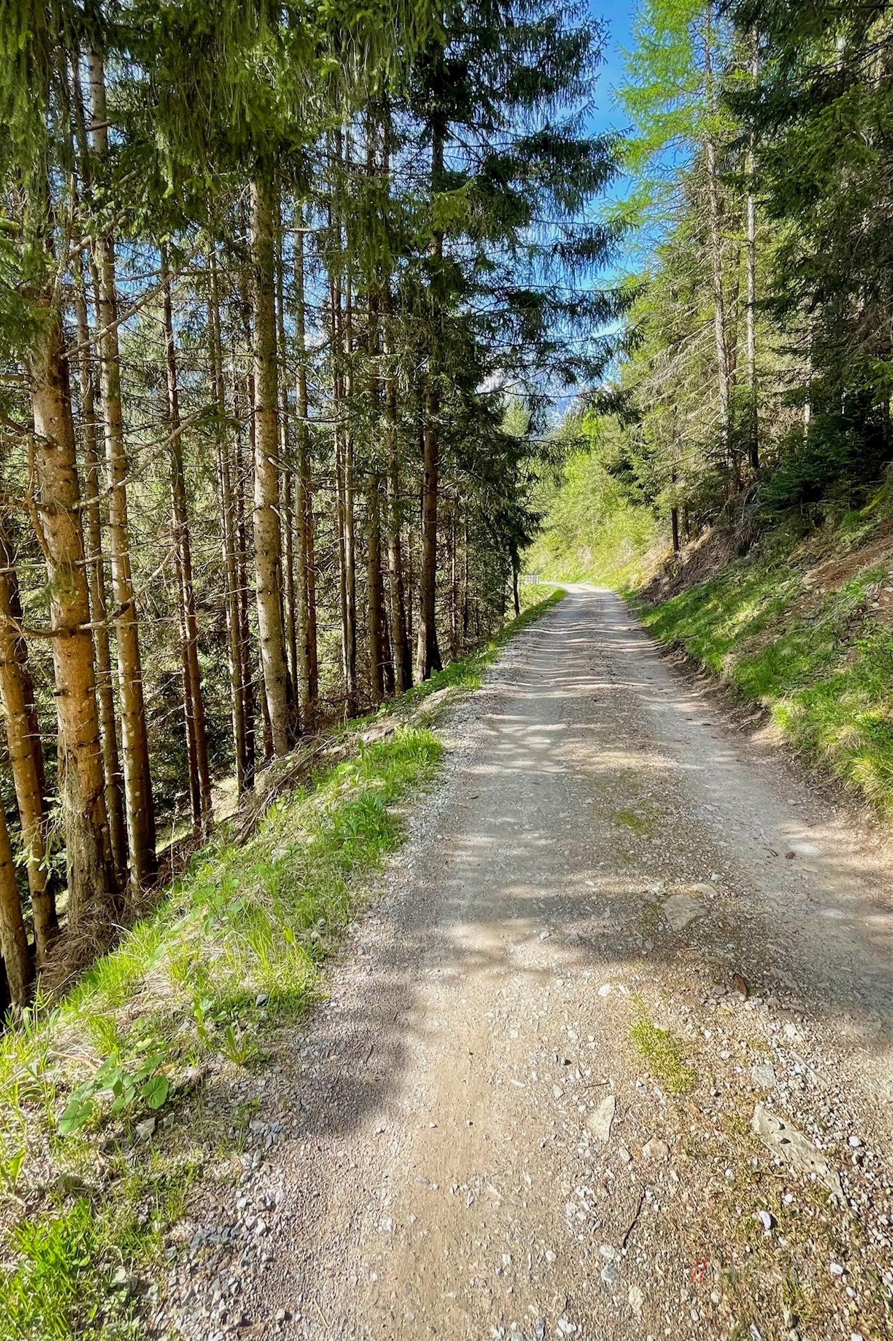 Hinter den letzten Höfen beginnt der eigentliche Aufstieg zur Hofstatt Alm. Er führt in sanften Serpentinen durch den schattenverheißenden Nadelwald, der hie und da schöne Ausblicke freigibt.
