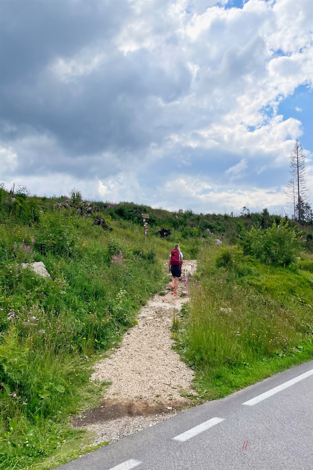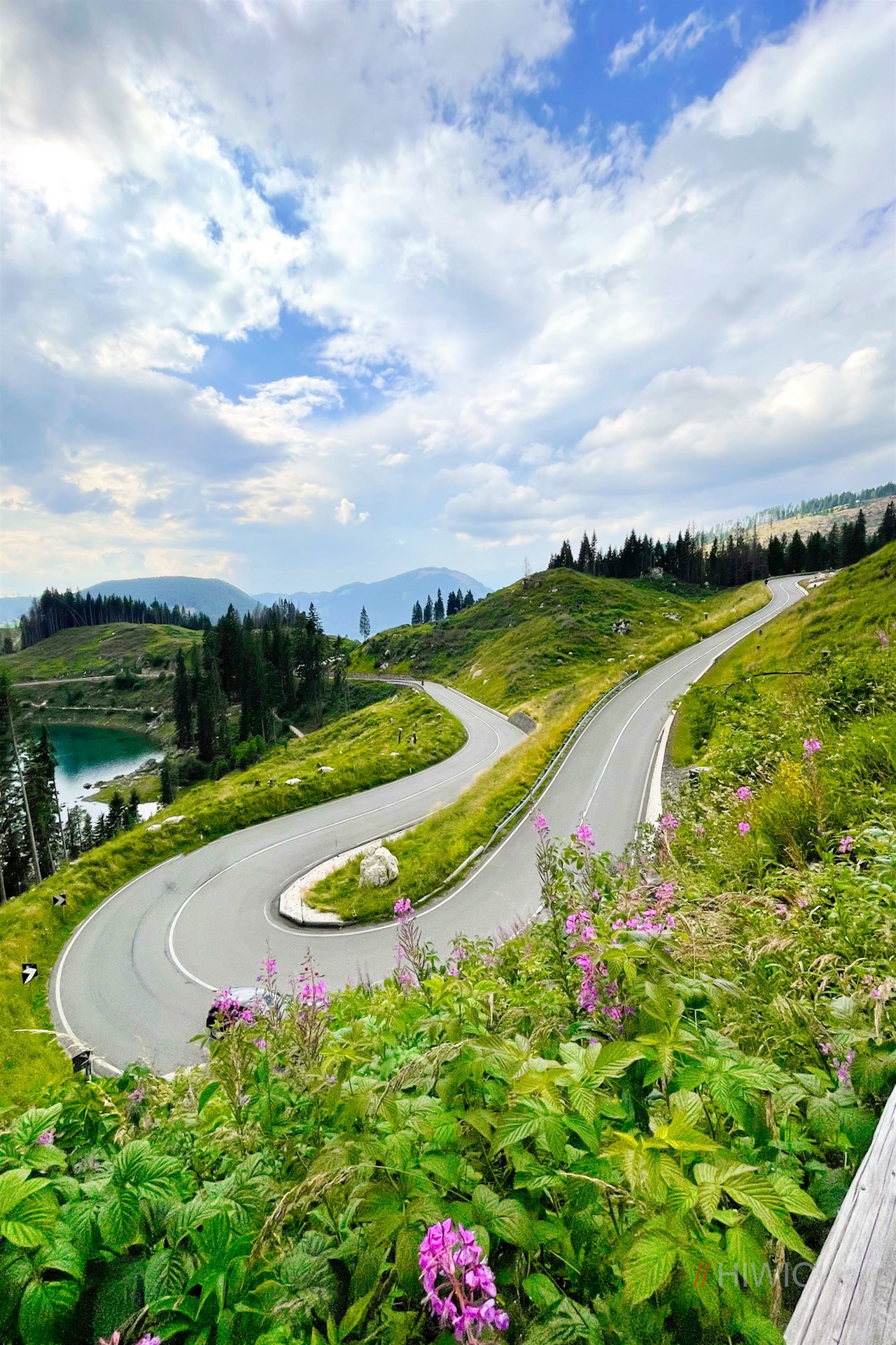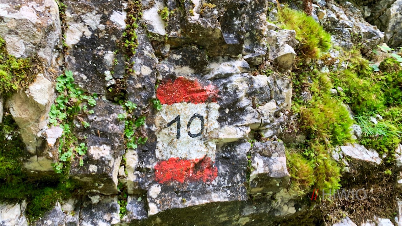 Vom Parkplatz wandert man auf dem asphaltierten Schönblickweg zur Karerpassstraße zurück, an der das Wanderschild Nr. 10 den Abstieg zum Karersee weist.