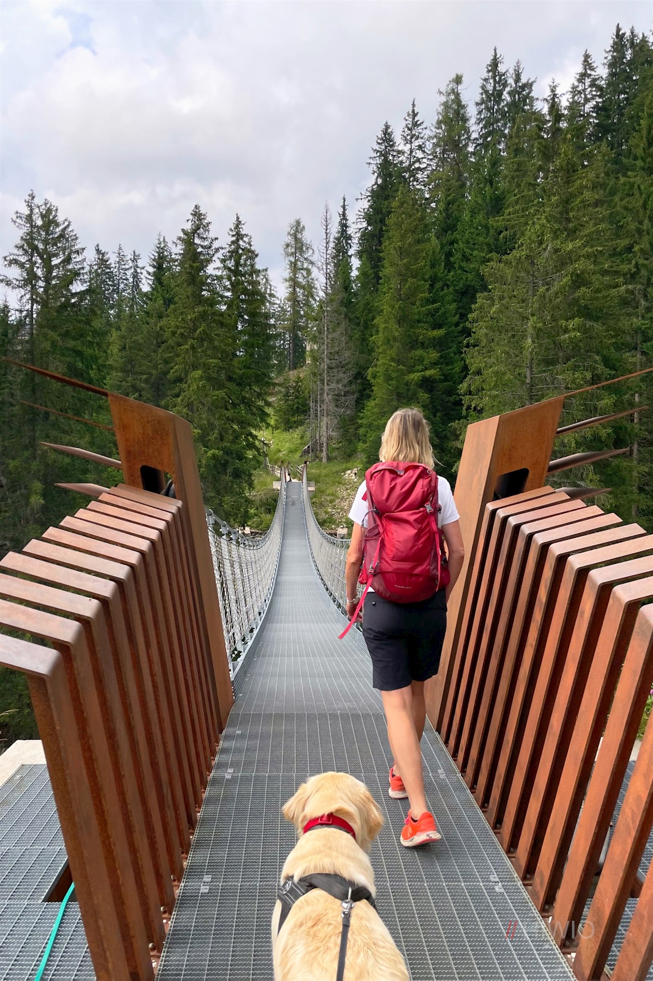 Durch die Unterführung am Nordufer gelangt man zum kostenpflichtigen Parkplatz auf der gegenüberliegenden Straßenseite, auf dem das Wanderschild Nr. 6 den Anstieg zur Siedlung Karersee weist. Er führt auf einer 58 m langen Hängebrücke über den Welschnofener Bach und steigt dann zum nunmehr nahen Ausgangspunkt bei der Pension Simhild an.