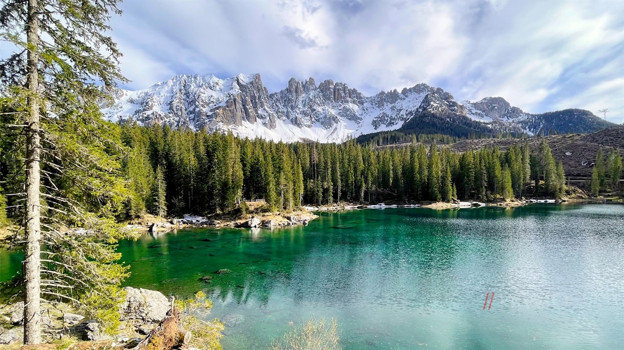 Wenig später erreicht man die Ufer des waldumsäumten Karersees, um den ein sanfter Spazierweg angelegt wurde. Er führt ohne Höhenunterschiede um dieses geheimnisvoll schimmernde Naturjuwel, das jährlich tausende Besucher in seinen Bann zieht. Wegen seiner idyllischen Lage am Fuße des Latemar und seines ungewöhnlichen Farbenspiels wird er auch als „Märchensee der Dolomiten“ bezeichnet.