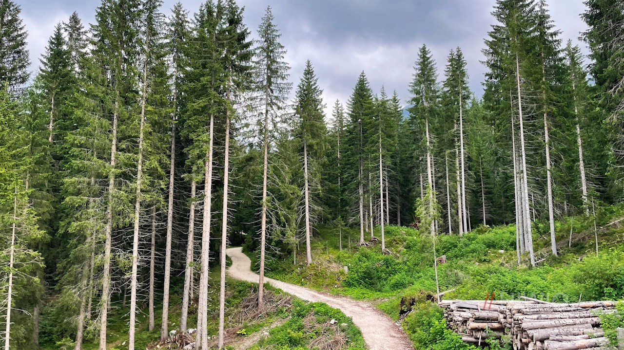 Er überquert zunächst die Passstraße und setzt sich dann auf einem sanft abfallenden Waldweg fort, auf dem sich bereits schöne Ausblicke auf den tiefer liegenden Karersee öffnen.