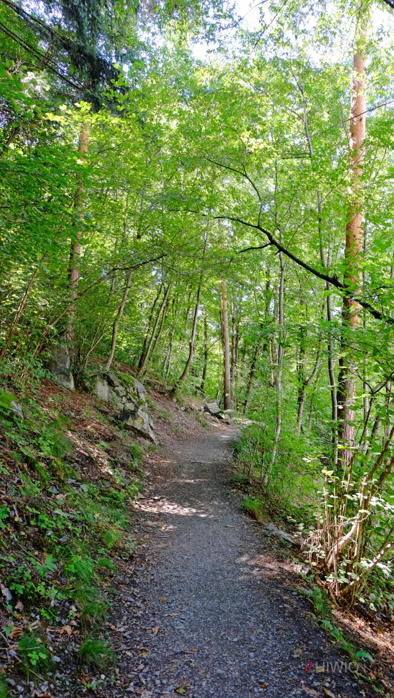 Nachdem man die letzten Häuser hinter sich gelassen hat, zweigt am linken Straßenrand die Karlspromenade ab. Sie führt im sanften Auf und Ab durch einen schattenverheißenden, lichten Laubwald, in dem im Frühling zahlreiche Leberblümchen und Huflattiche gedeihen.