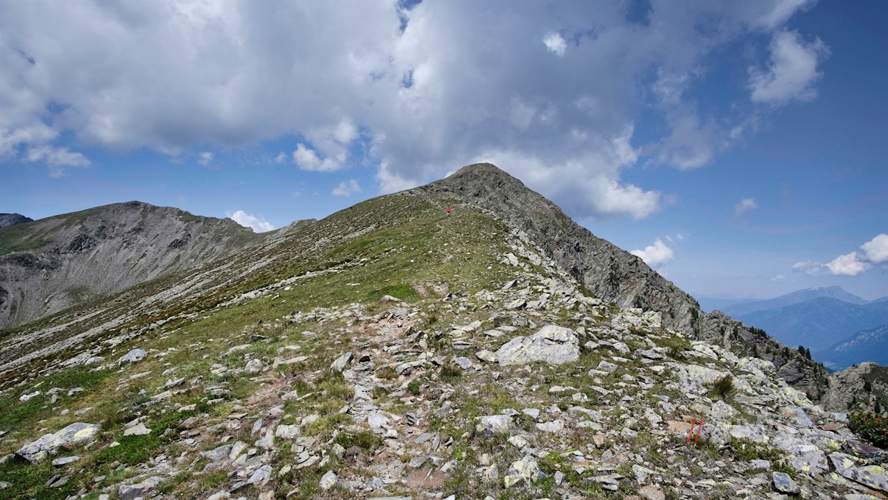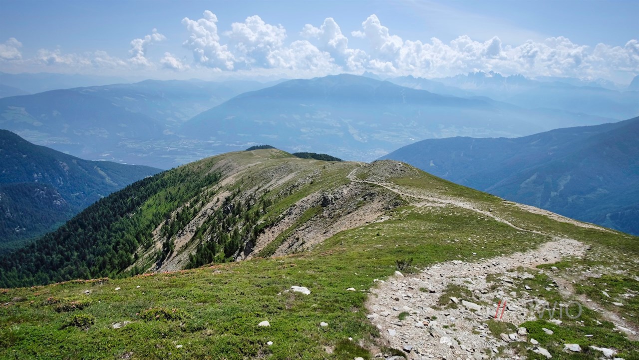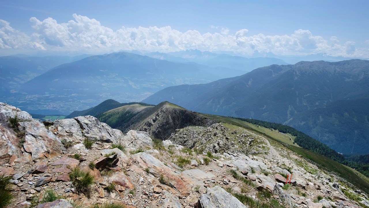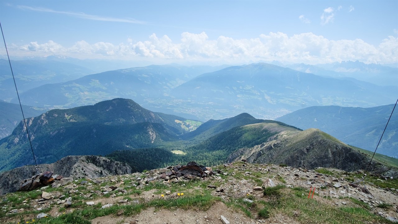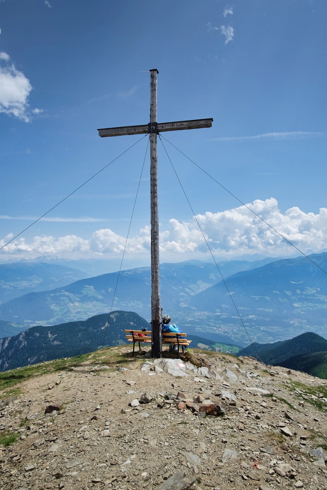 Hinter der Baumgrenze führt der Wanderpfad im teils sanfteren, teils steileren Anstieg über die langgezogene Gipfelflanke der Karspitze. Neben dem hölzernen Gipfelkreuz entfaltet sich schließlich ein nahezu unendlich anmutendes Panorama: Der Blick schweift von den Sarntaler Alpen über die Pfunderer Berge, die Rodenecker Alm und die Plose zu den in der Ferne aufragenden Dolomiten.