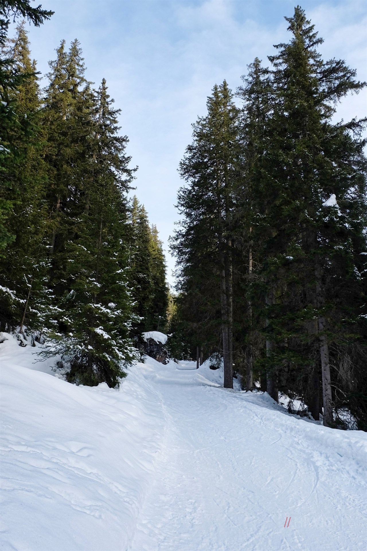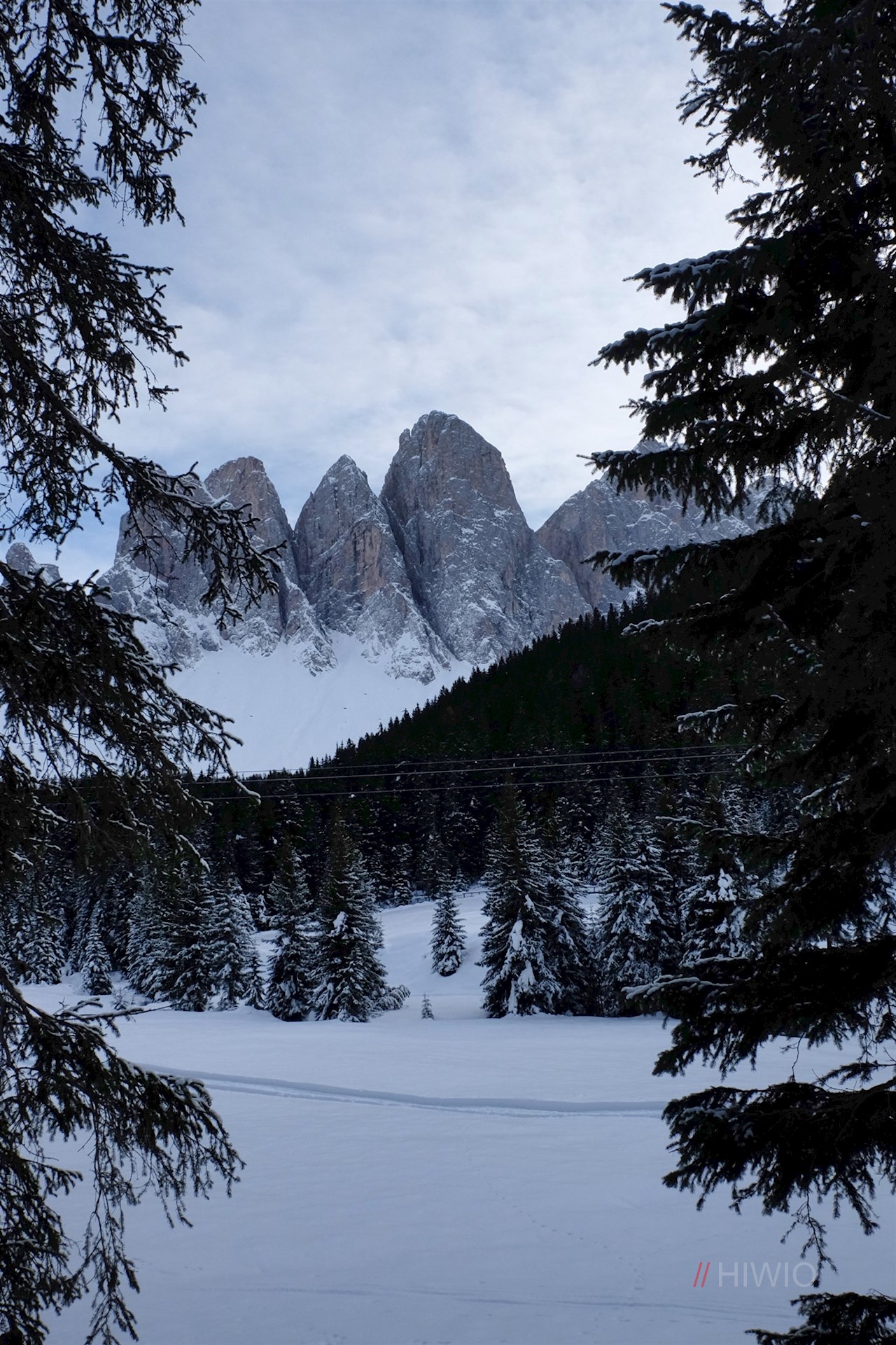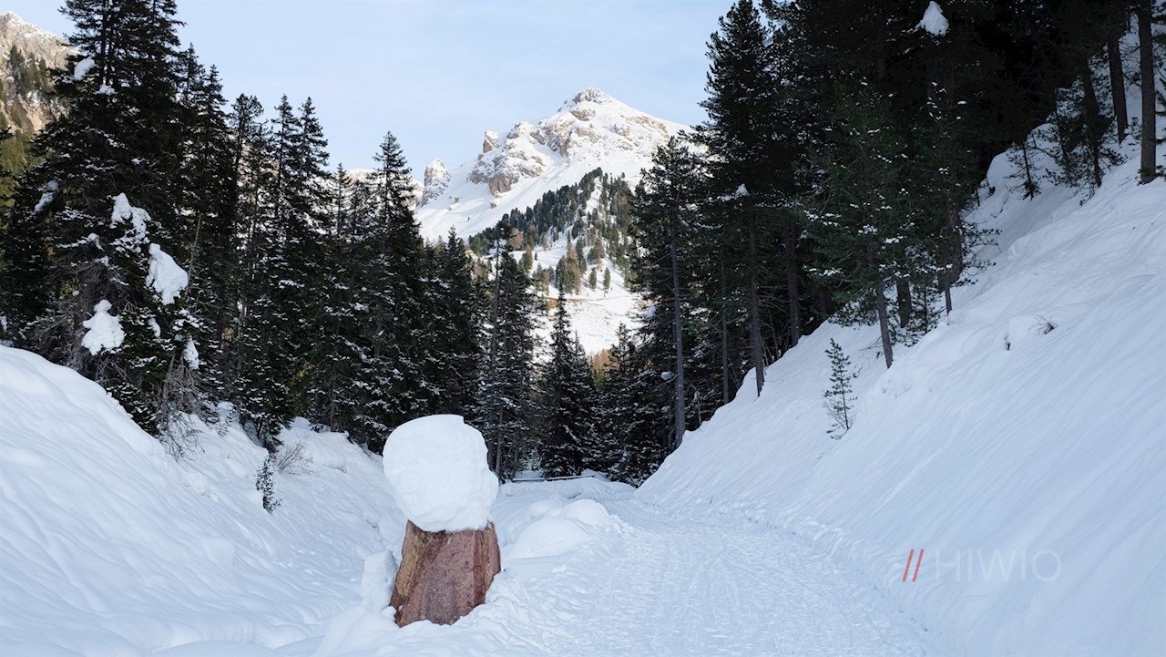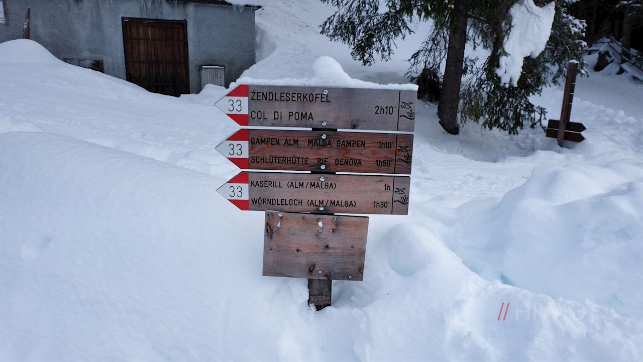 Am Parkplatz schlägt man den Wanderweg Nr. 33 in Richtung Kaserill Alm ein. Er steigt sanft durch den winterlich verschneiten Nadelwald an und eröffnet dabei immer wieder verträumte Ausblicke auf die schneebedeckten Villnösser Geisler und den Zendleser Kofel.