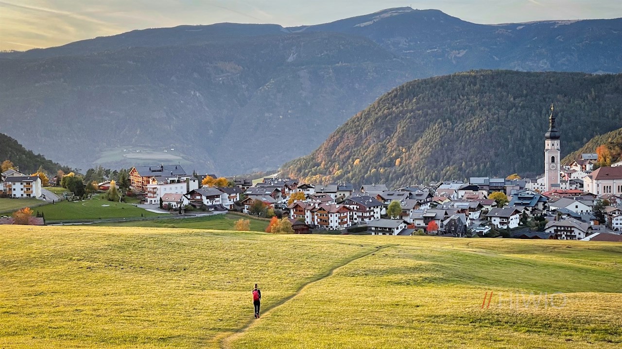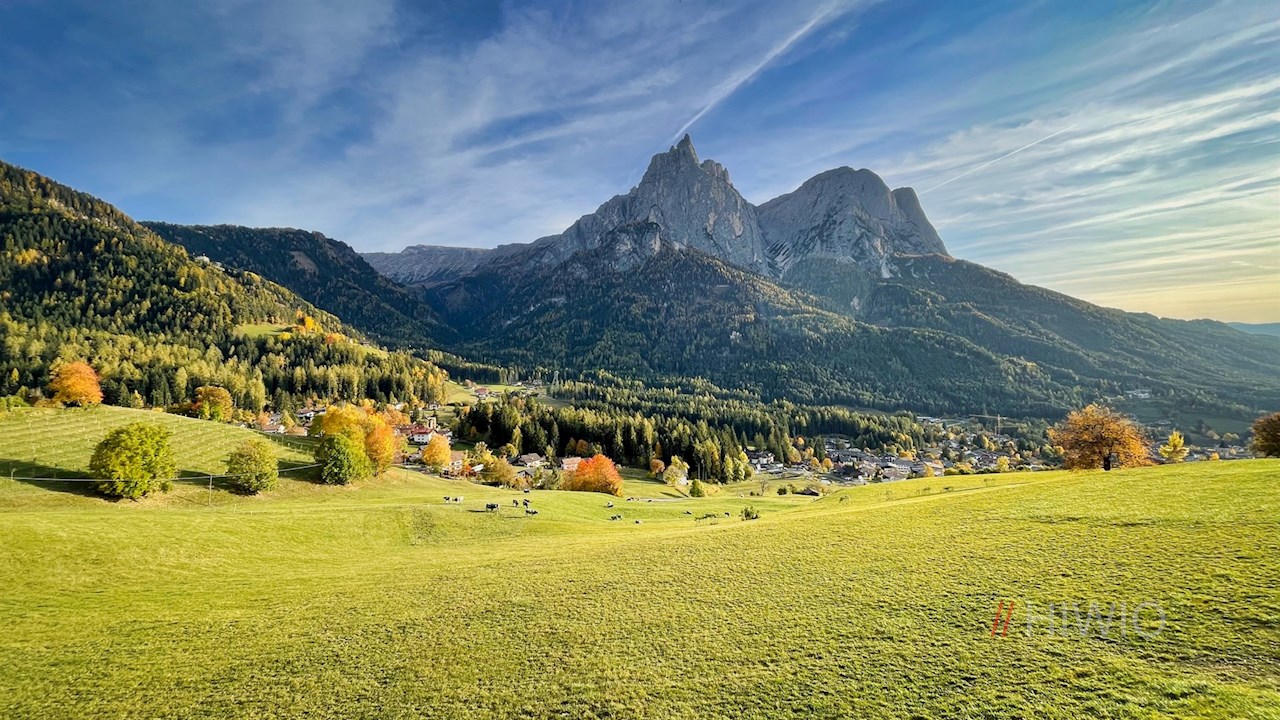 Schließlich zweigt am rechten Wegesrand der anfangs noch asphaltierte Weg Nr. 4 nach Kastelruth ab. Er fällt wenig später durch sanft gewellte Weidewiesen ins nunmehr nahe Dorf ab und öffnet dabei bezaubernde Ausblicke auf Kastelruth, den Schlern und die restliche ringsum aufstrebende Bergwelt.