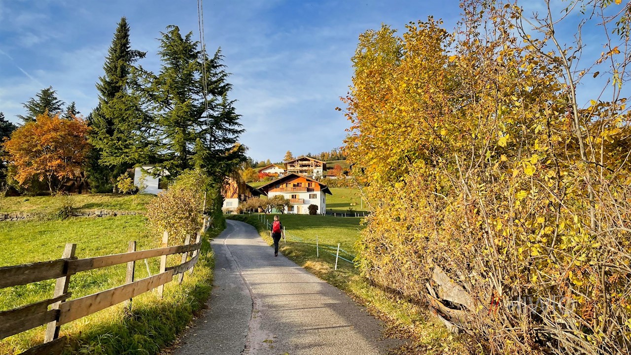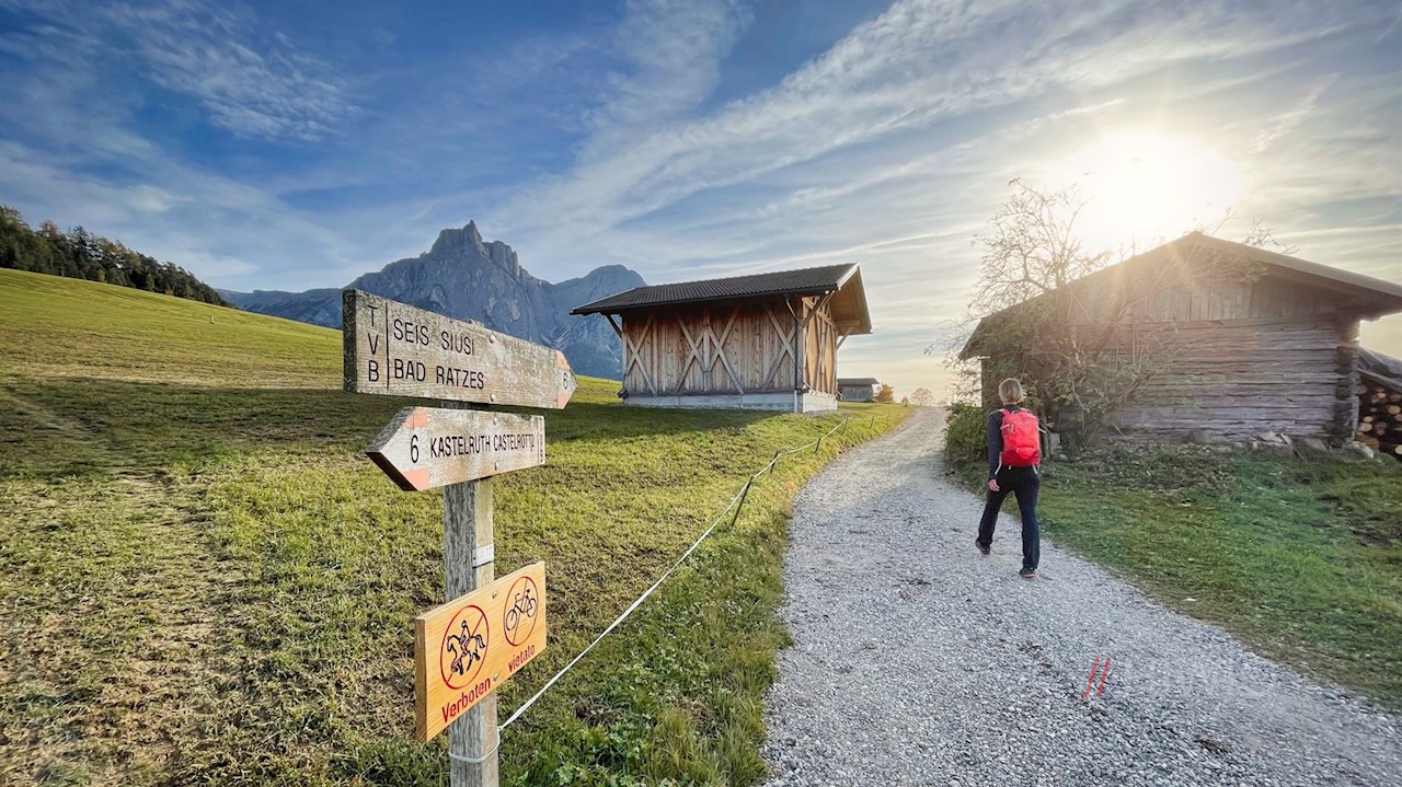Er folgt zunächst einem asphaltierten Sträßchen, das zum oberen Dorfrand hochführt und schließlich in einen breiten Schotterweg mündet. Dieser zieht sich nahezu eben durch malerische Weidewiesen und öffnet dabei faszinierende Nahblicke auf den majestätischen Schlern.