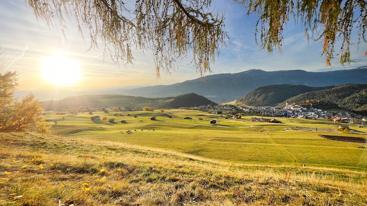 Schließlich erreicht man die ersten Höfe des Streuweilers St. Valentin, bei denen der Weg Nr. 13A abzweigt. Nun ist die St. Valentin Kirche aus dem 13. Jahrhundert nicht mehr fern: Inmitten sanfter Wiesen präsentiert sie sich wenig später vor der majestätischen Kulisse der Schlern.