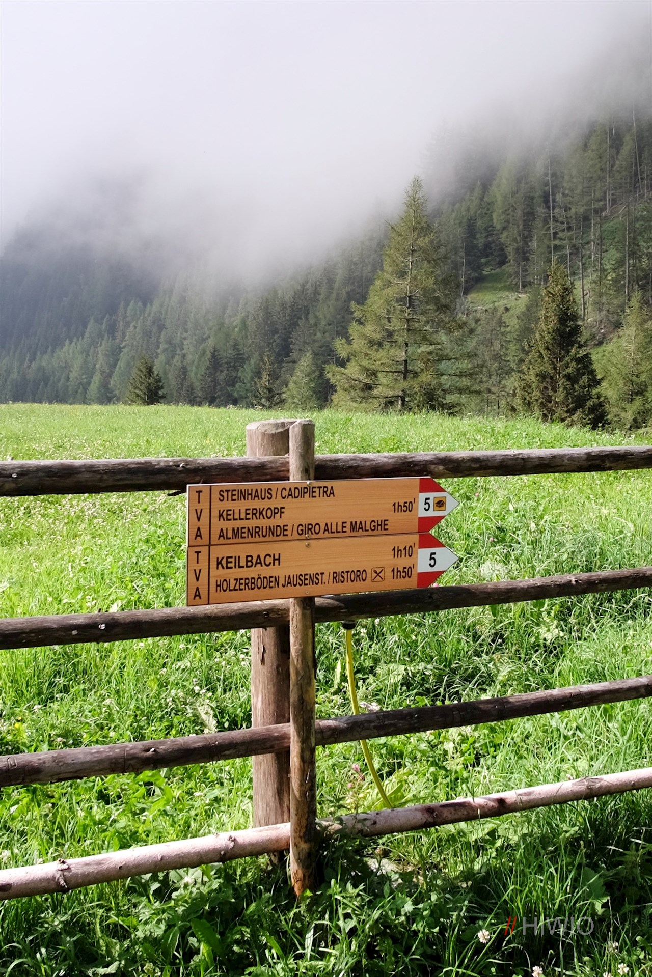 Dem Wegweiser Nr. 5 in Richtung Wollbachalm folgend, wandert man zunächst eine asphaltierte Straße hoch, von der kurz darauf der Wanderweg Nr. 5 abzweigt. Dieser steigt ziemlich steil durch den harzduftenden Wald an, wobei er nacheinander in die Steige 5a und 5c übergeht.