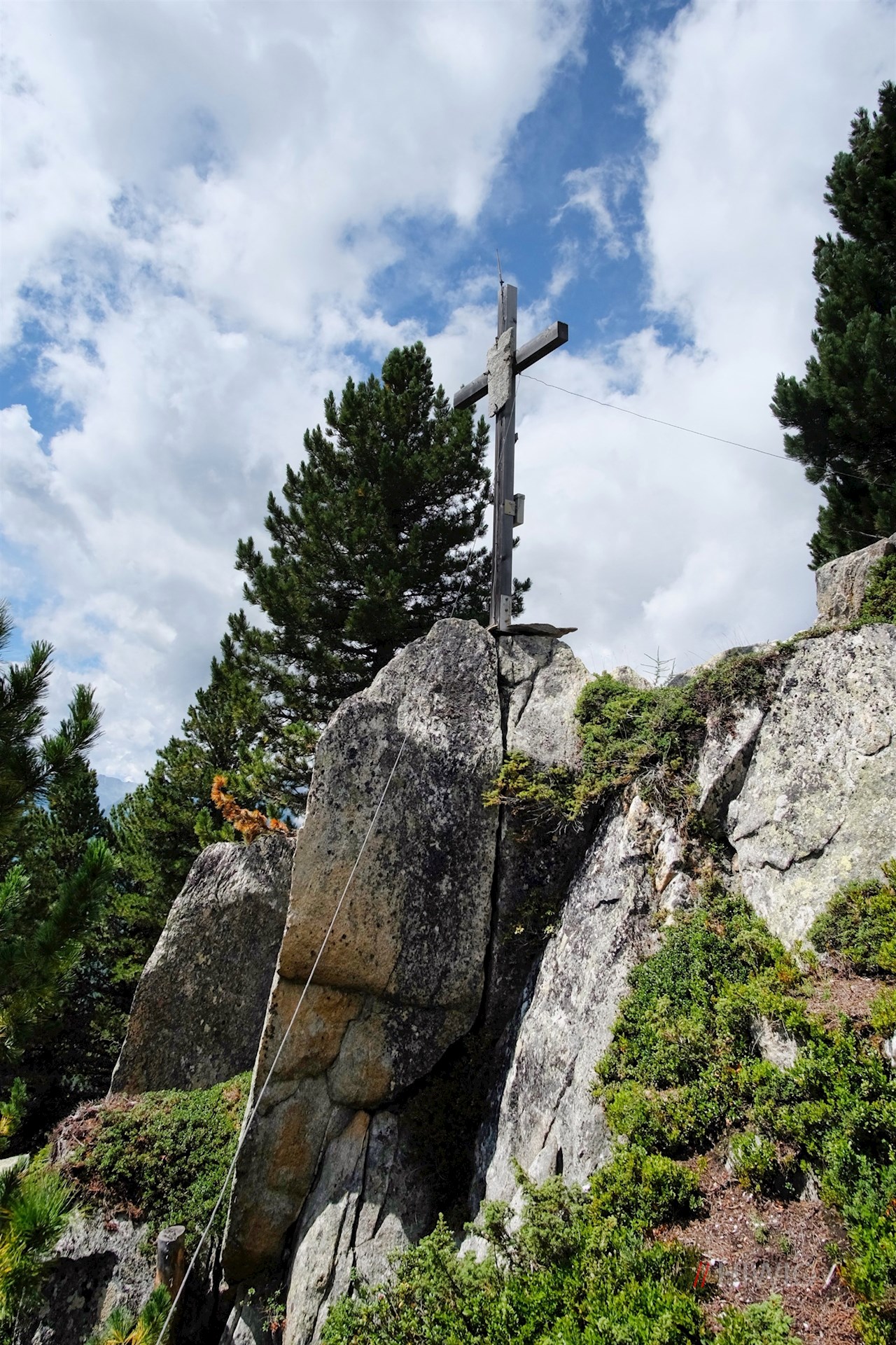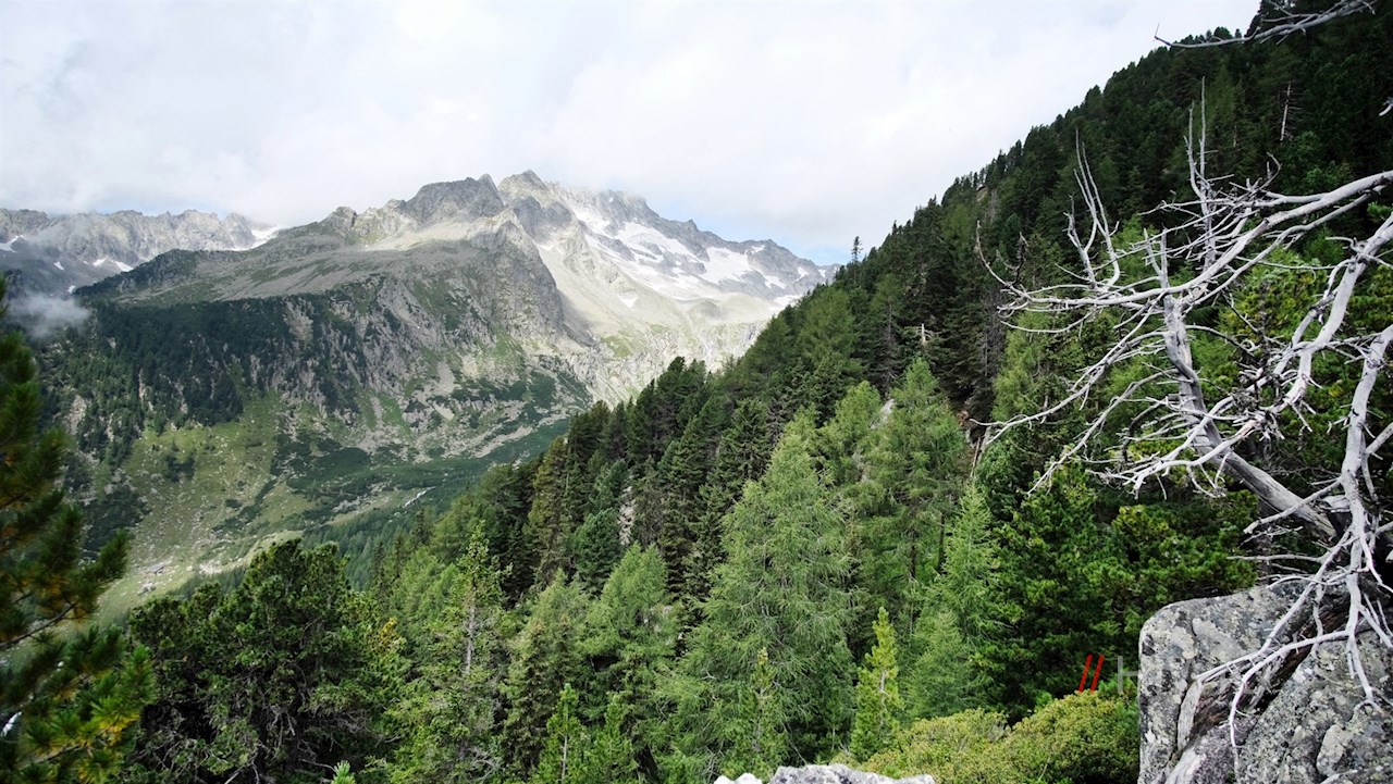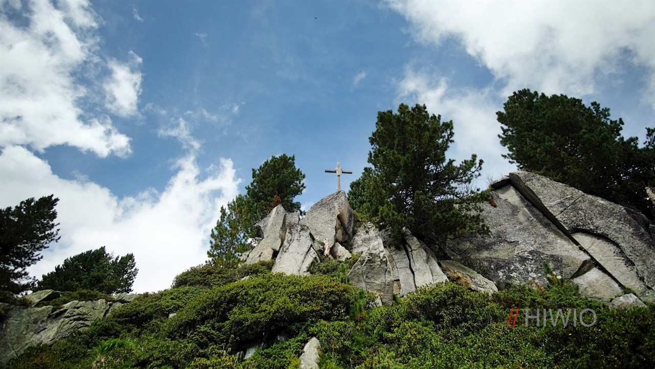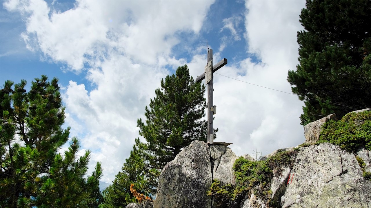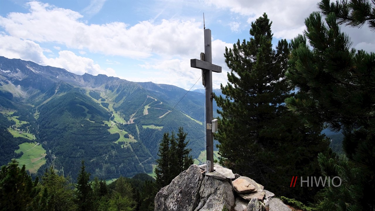 Auf dem kreuzgeschmückten Waldgipfel des Kellerkopfes werden die Mühen des Anstiegs mit einem unerwartet weitreichenden Ausblick auf das Ahrntal und seine imposante Bergwelt belohnt.